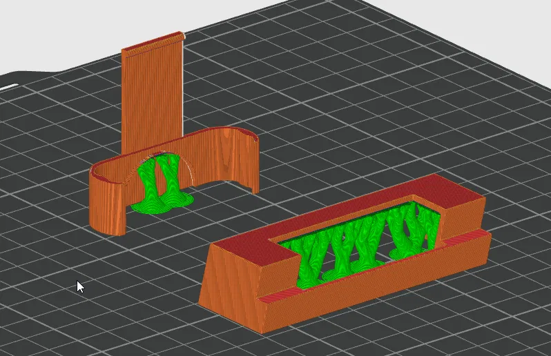 Còn cái kẹp đeo lưng thì in bằng nhựa PETG, chỉnh layer height 0.12mm, 3 vòng tường (wall loops) và cũng xài organic tree support luôn cho nó chuẩn.