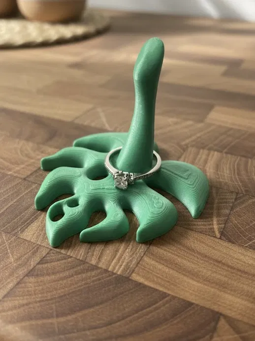 Đế cắm nhẫn hình lá monstera nhỏ gọn, dáng điêu khắc, thiết kế print in place không cần supports. Thao tác đeo/tháo nhẫn một tay tiện lợi, hợp để trên tab đầu giường, vanity, bàn làm việc. In nhanh, dễ in cho người mới.