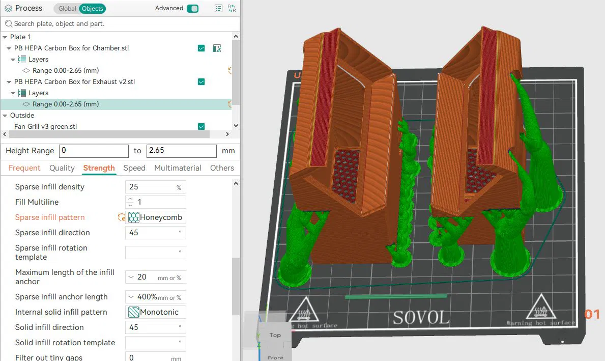 Với hộp HEPA carbon, dùng height range modifier trong slicer. 0–2,65mm – mình dùng honeycomb 25%.