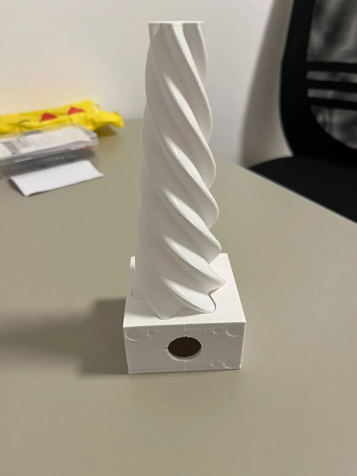 Hình học của chụp tán sáng được tạo bằng mô hình hóa parametric trong OpenSCAD, dựa trên biên dạng hoa xoắn được extrude dọc theo trục đứng. Phần này được in ở chế độ spiral/vase mode, tạo cấu trúc nhẹ với khả năng khuếch tán ánh sáng mượt. Phần đế và nắp đáy được in ở standard mode để đảm bảo độ cứng cơ khí.