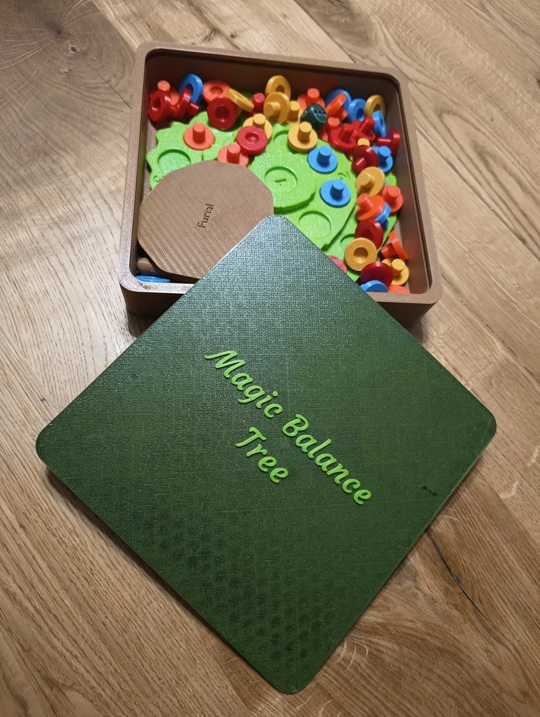 Mẫu “Balancing game - stackable Magic Balance Tree” được thiết kế từ đầu với các quân cờ có thể chồng lên nhau. Có 2 bảng (có số/không số), chơi từ 4 người trở lên. Kèm chân đế gập và hộp nắp trượt; in không cần support.