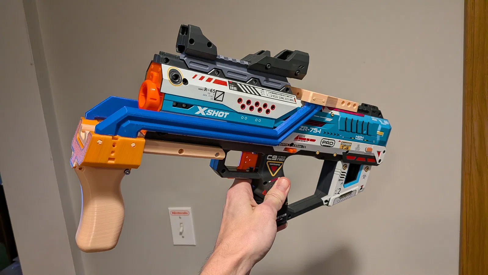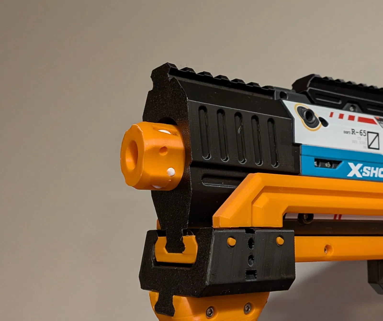 Đã thêm ốp trước (front shroud) kèm phần nối dài nòng (barrel extension) có hỗ trợ gắn các phụ kiện tương thích “silly”. Phần gắn ốp này không có trong video lắp ráp. Cần tháo 2 con vít ở phía trước bên trái của blaster để nhả tấm mặt trước (front plate). Ốp sẽ thay thế tấm mặt trước zin. Ngoài ra, có thể dùng một vít M3x30 ở vị trí mở trên slide để nối slide với shroud chắc chắn hơn.