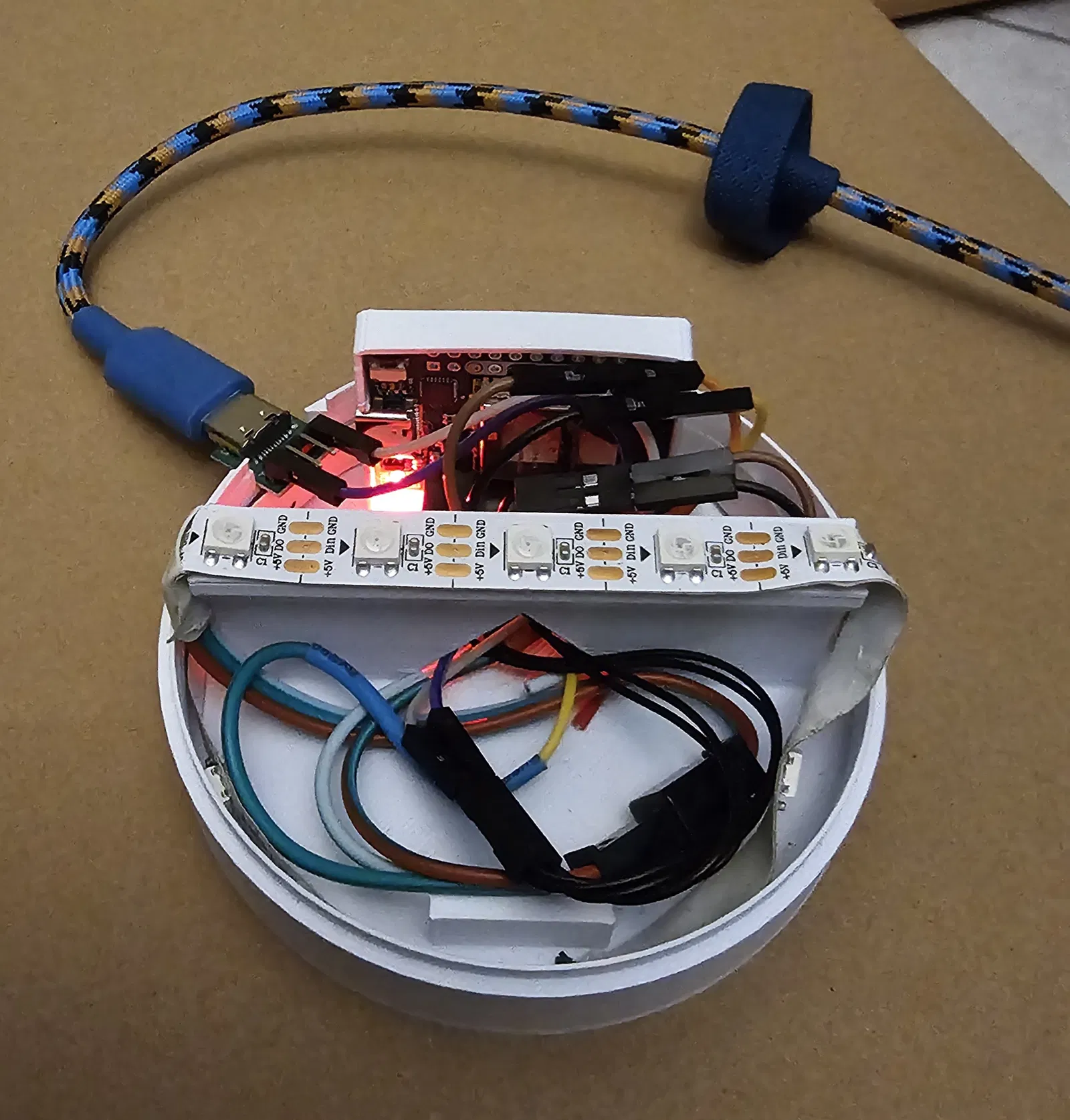 Nếu bạn gắn LED cả ở phía trên lẫn hai bên, mình khuyên nên tách nguồn giữa ESP32 và LED, vì cấp nguồn cho LED trực tiếp từ ESP32 sẽ hay phát sinh lỗi/vấn đề. Trong hình, cổng USB-C là giải pháp “tạm mà thành cố định” cho tới khi mình dán/định vị được một cái cổng cho đàng hoàng.