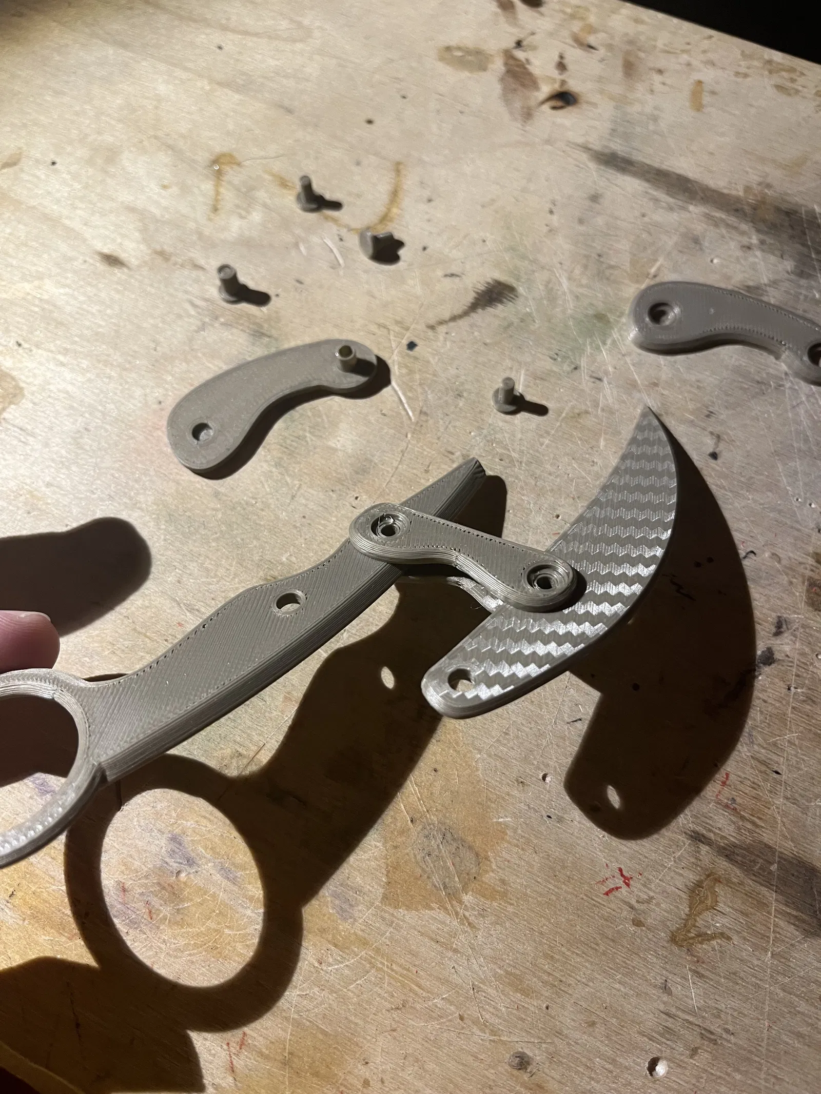 Mẫu Foldable Carambit là một món fidget toy vui tay, in dễ và không cần hardware để lắp. In PLA với 5% infill (gyroid). Nhớ tải đủ STL: cần 4 file pin1 và 4 file pin2; có thể dán keo để chắc hơn.
