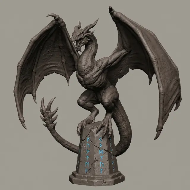 Figurine rồng canh gác mang màu sắc quỷ dữ được làm rất chi tiết, với đôi cánh to khỏe, thân hình cơ bắp và chiếc đuôi dài kết thúc bằng một mũi nhọn. Model đứng trên bệ trang trí có các ký tự rune, tạo cho toàn bộ cảnh một không khí huyền bí và u tối.