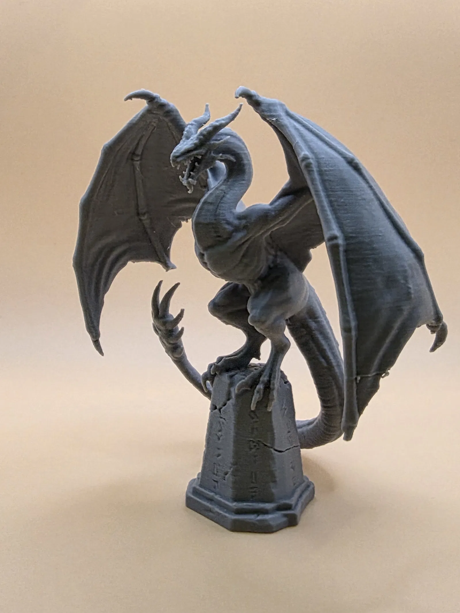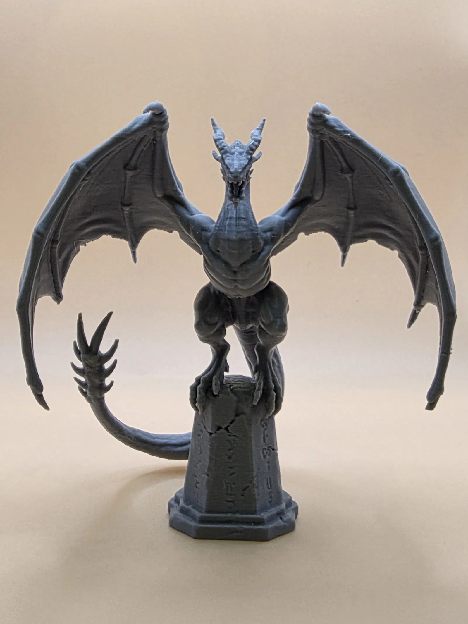 Figurine Demonický Drak Strážce cực kỳ chi tiết với cánh lớn, thân cơ bắp và đuôi dài có mũi nhọn, đứng trên bệ khắc rune u tối. Thiết kế tối ưu để dễ 3D print và vẫn đẹp ở tỉ lệ nhỏ.