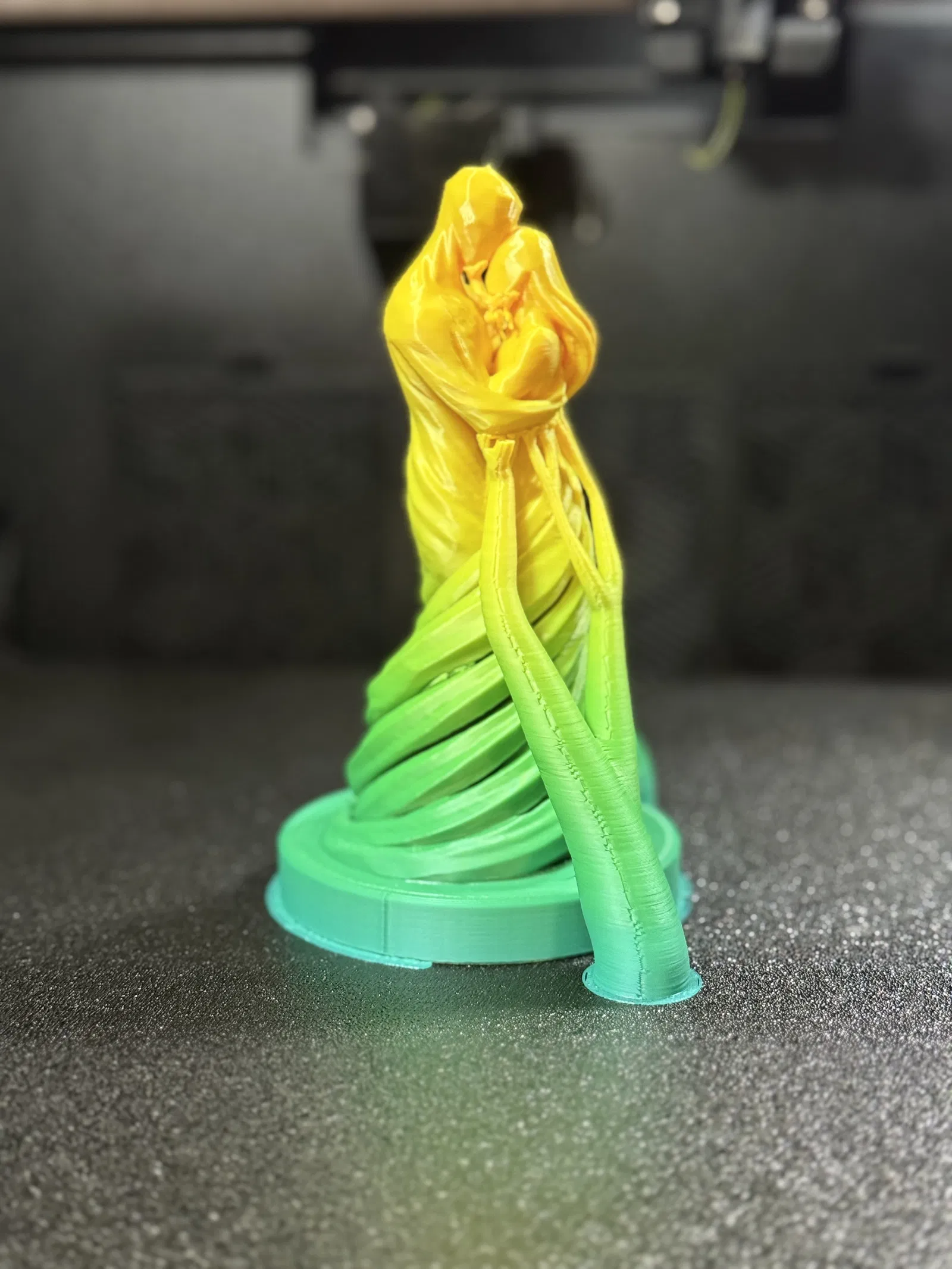 Nên in bằng máy dual-extruder để tạo hiệu ứng chuyển màu (gradient), hoặc canh đổi filament thủ công thật kỹ để ra kết quả đẹp nhất. Vật liệu khuyến nghị là PLA để bề mặt mịn.