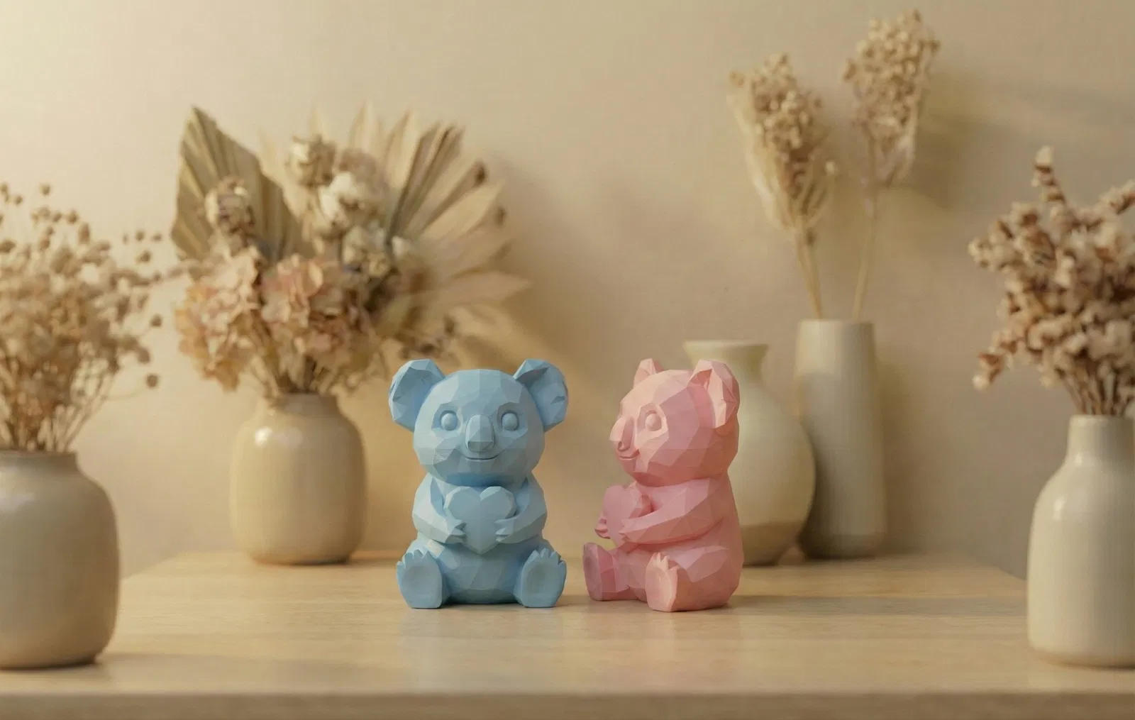 Gửi lời yêu thương bằng mẫu Low Poly Koala ôm trái tim siêu dễ thương. Phong cách Origami/Japandi tối giản, bề mặt faceted bắt sáng đẹp—hợp làm quà Valentine, Mother’s Day hoặc decor bàn làm việc.