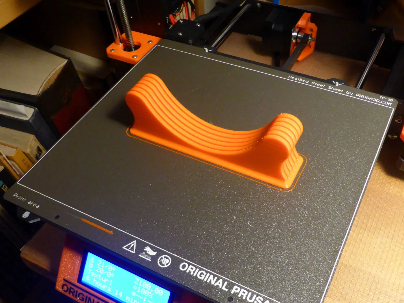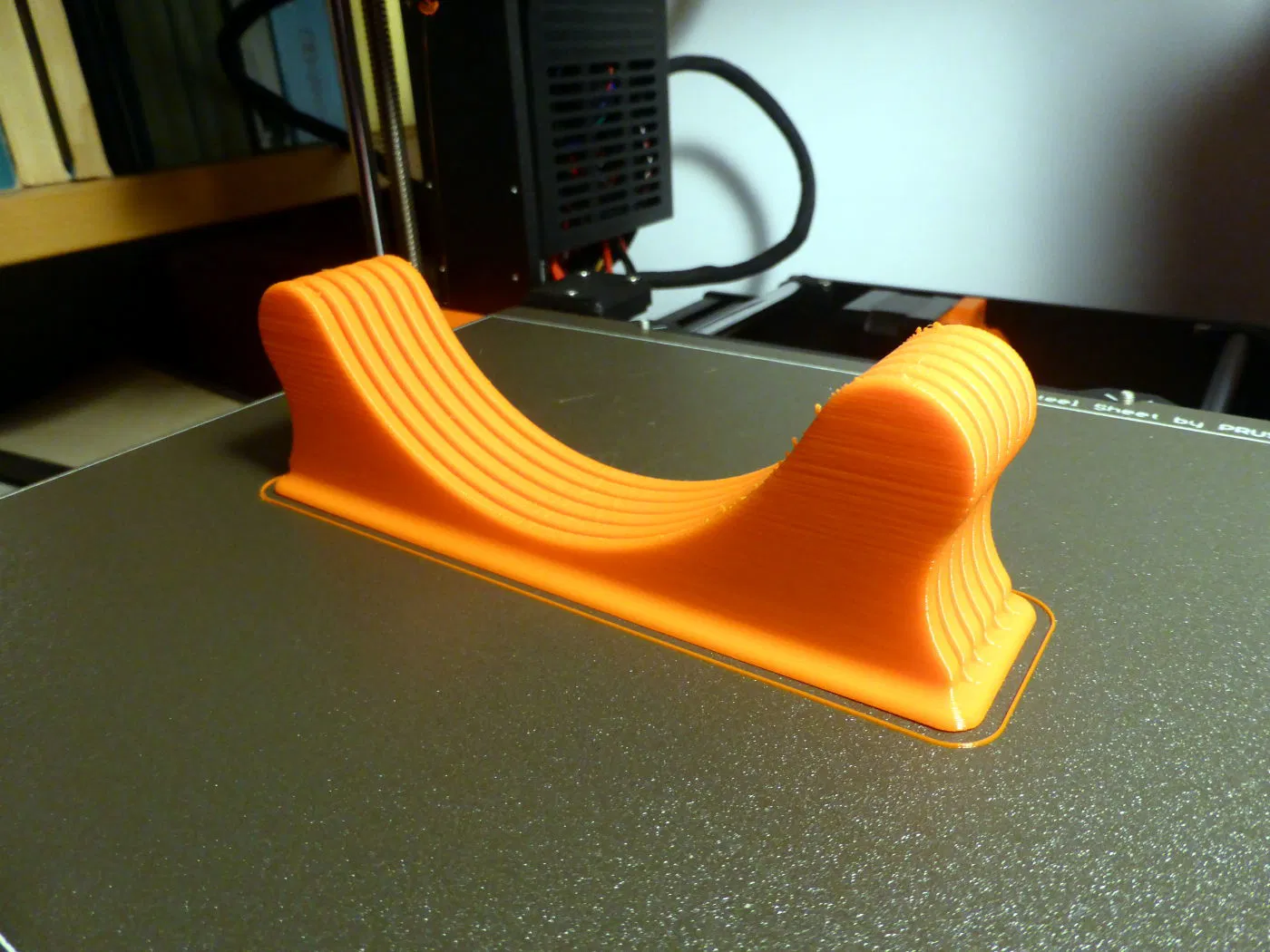 Mẫu trong hình được in bằng filament Prusament Prusa Orange PETG, cho độ bền cao và màu sắc nổi bật.