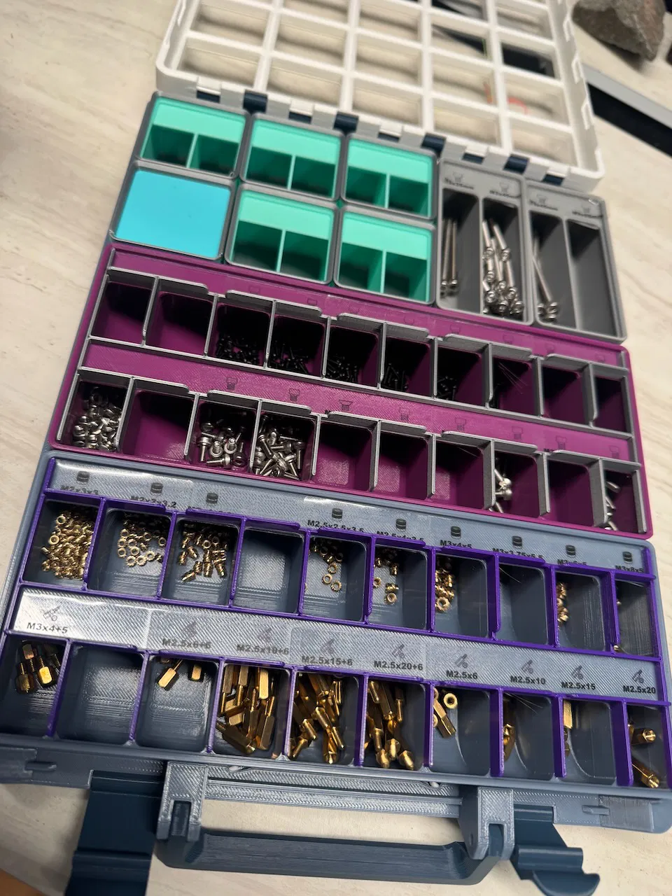 Cụ thể dành cho bin Gridfinity 5x2 với 10x2 ngăn nhỏ tách riêng bên trong có nhãn, và dùng trong Modern Case. Mình chỉ mới test với bản cửa sổ “snap-in” của @Neppo_412215.
