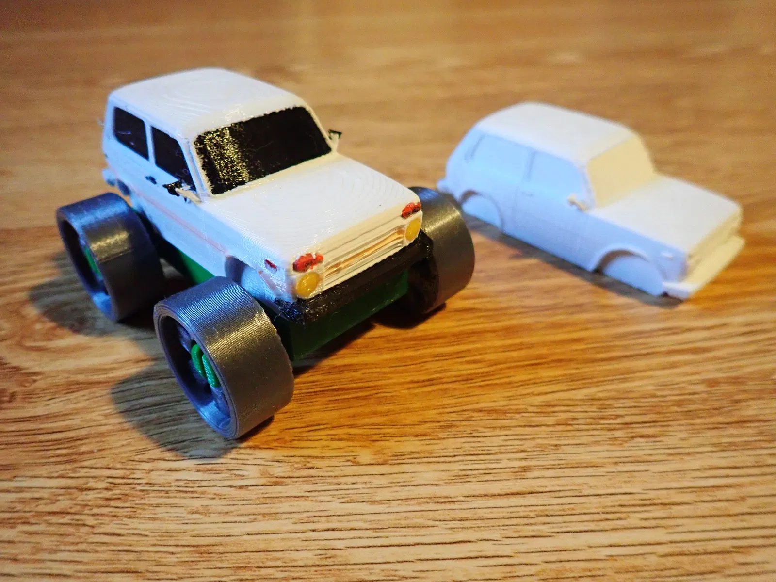 Mình dùng một mẫu Lada Niva mình tìm được, rồi chỉnh sửa khá nhiều để tích hợp chức năng Duplo. Phần chassis cũng làm tương tự. Còn bánh xe là mình tự thiết kế hoàn toàn. In bằng PETG. Chạy/ghép được với gạch Duplo.