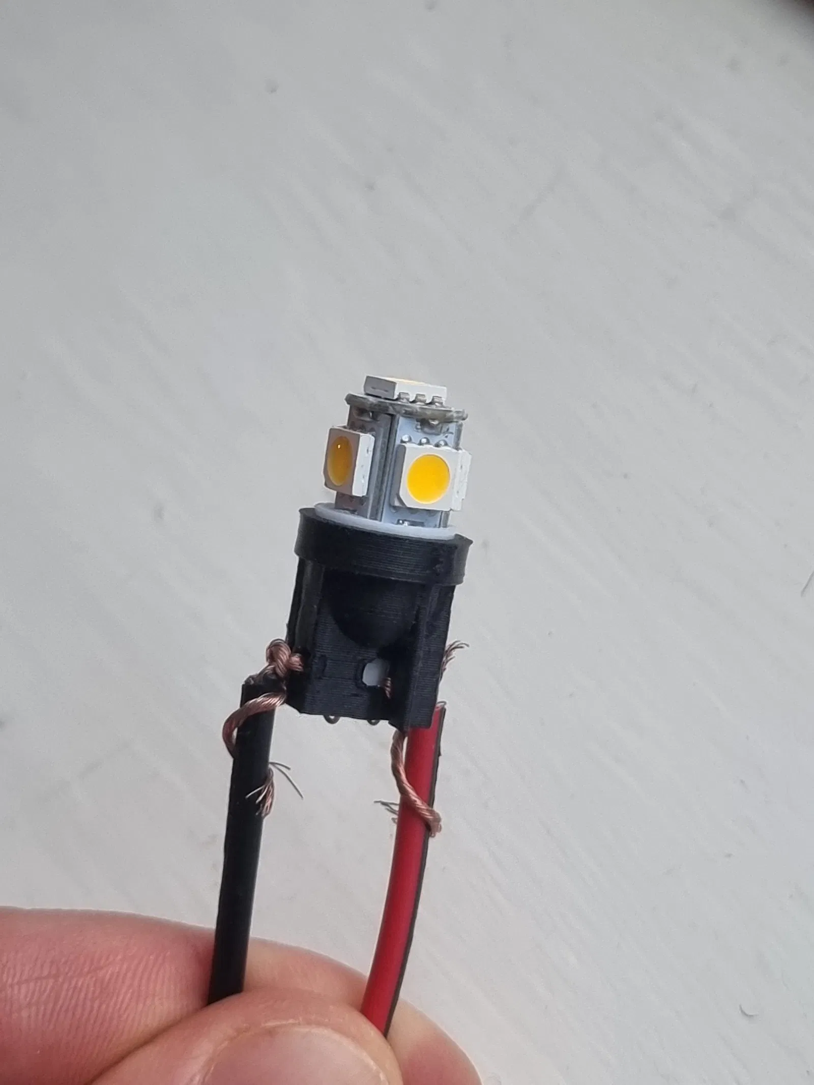 Không cần hàn (no soldering) – bạn chỉ cần 1 chi tiết đã in, 1 bóng đèn W5W và 2 sợi dây 0.5mm² (tùy chọn gắn thêm pins ở đầu còn lại – thậm chí bạn có thể dùng đinh hoặc một đoạn dây đồng lõi đơn).