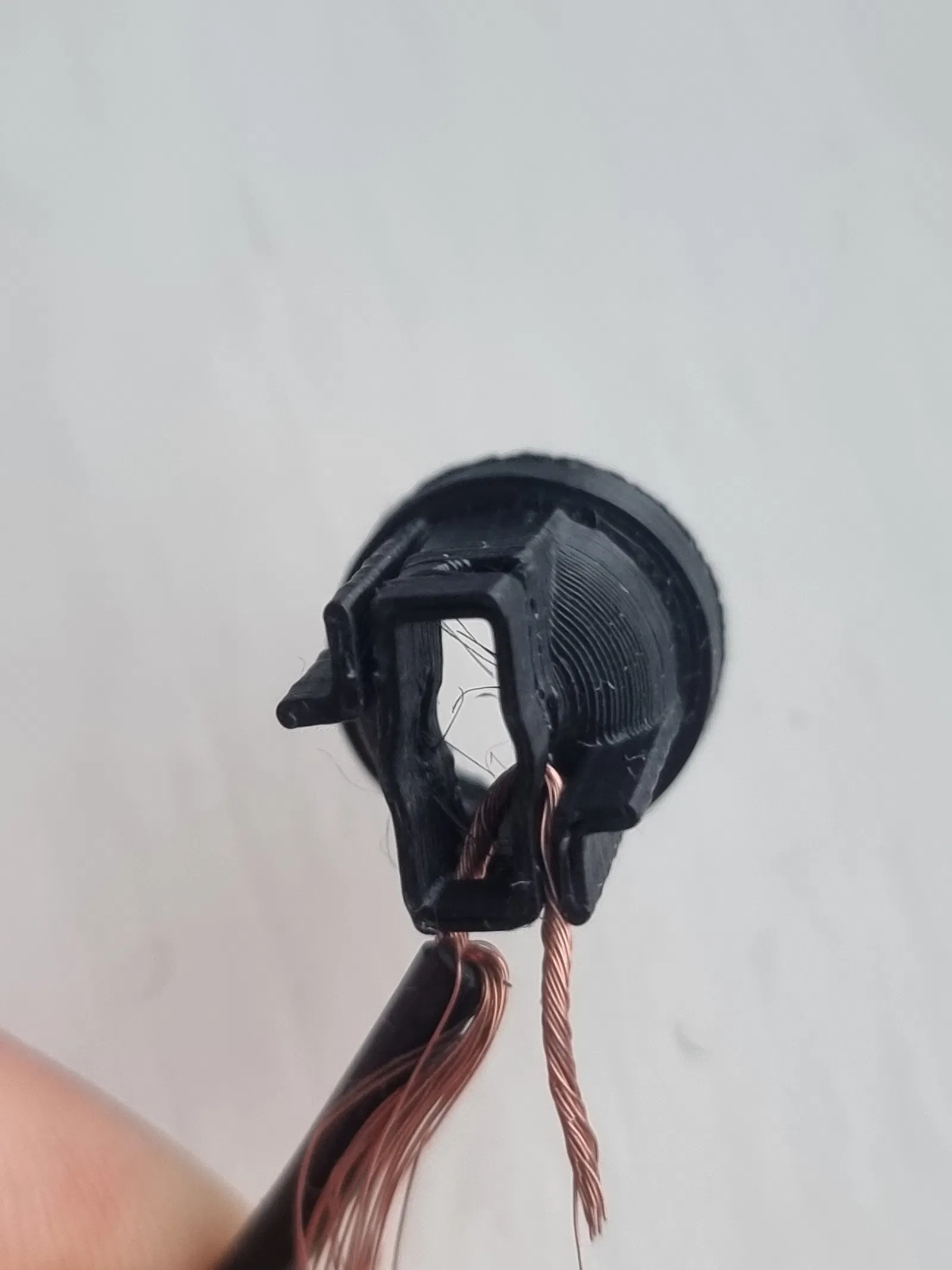 Bạn luồn 2 sợi dây nguồn qua 2 lỗ: đi vào từ một bên vỏ rồi đi ra ở giữa vỏ – chính sợi dây sẽ giúp bóng ngồi chắc. Thiết kế hợp với dây 0.5mm², nhưng bạn vẫn có thể dùng dây to hơn rồi xoắn/thu nhỏ phần đầu dây lại cho vừa.