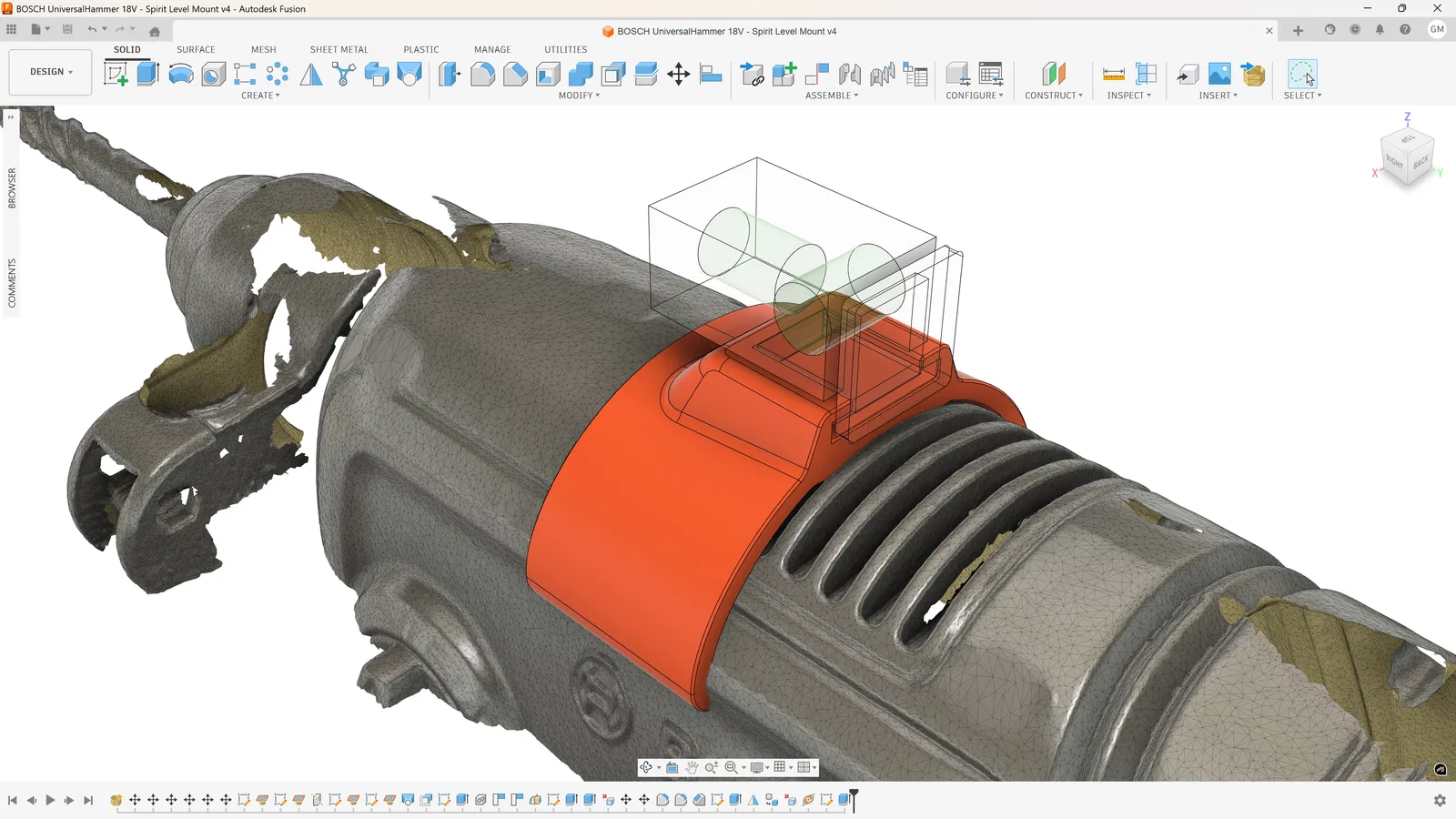 Mình cần một giải pháp để đảm bảo các lỗ khoan khi lắp kệ treo (floating shelf) sẽ vuông góc với bề mặt tường, và một Spirit Level gắn lên dụng cụ có vẻ là lựa chọn hợp lý. Thế là sau khi 3D scan và dựng CAD một chút, mình làm ra được cái Mounting Clip để gắn một cái.