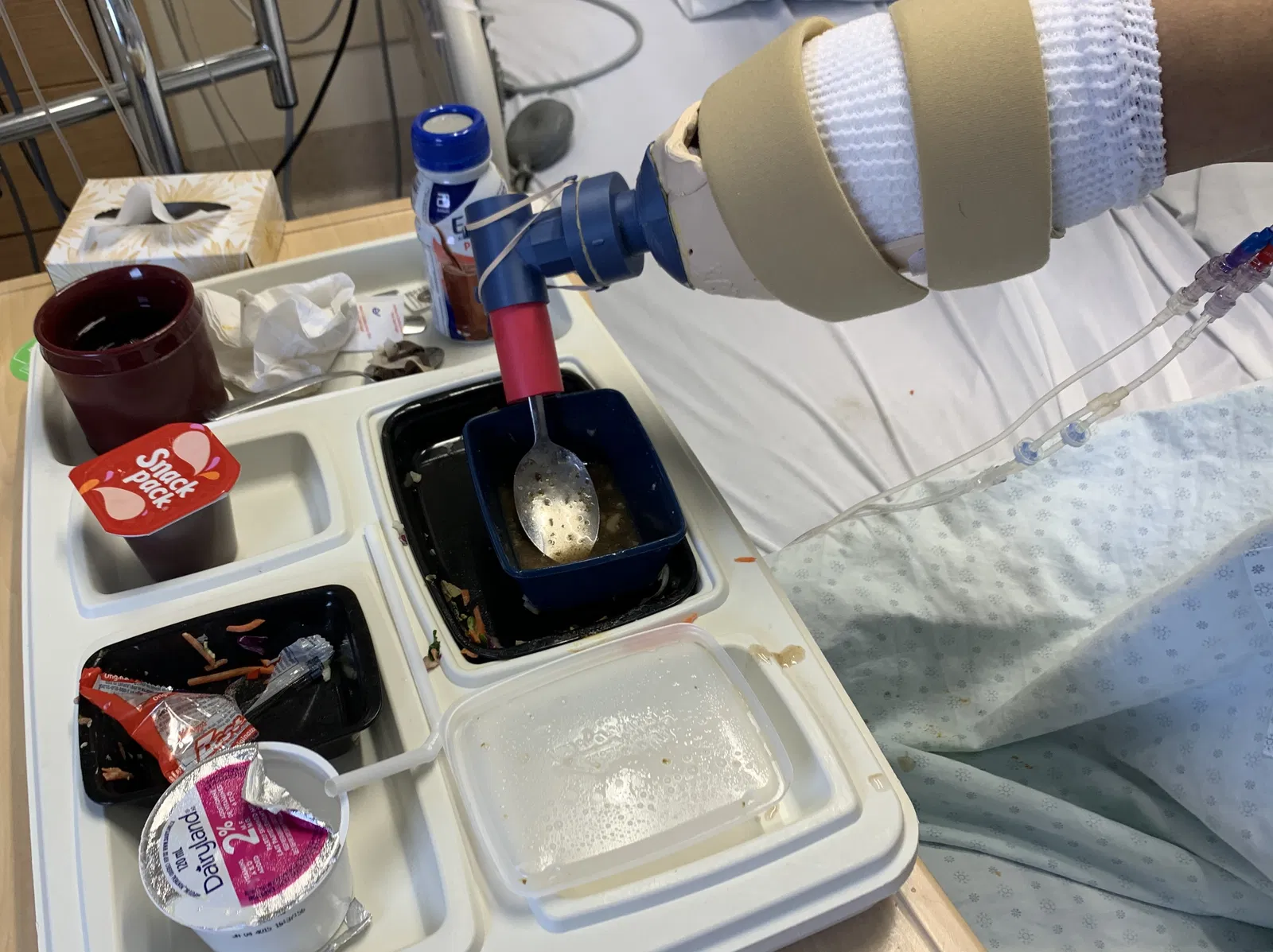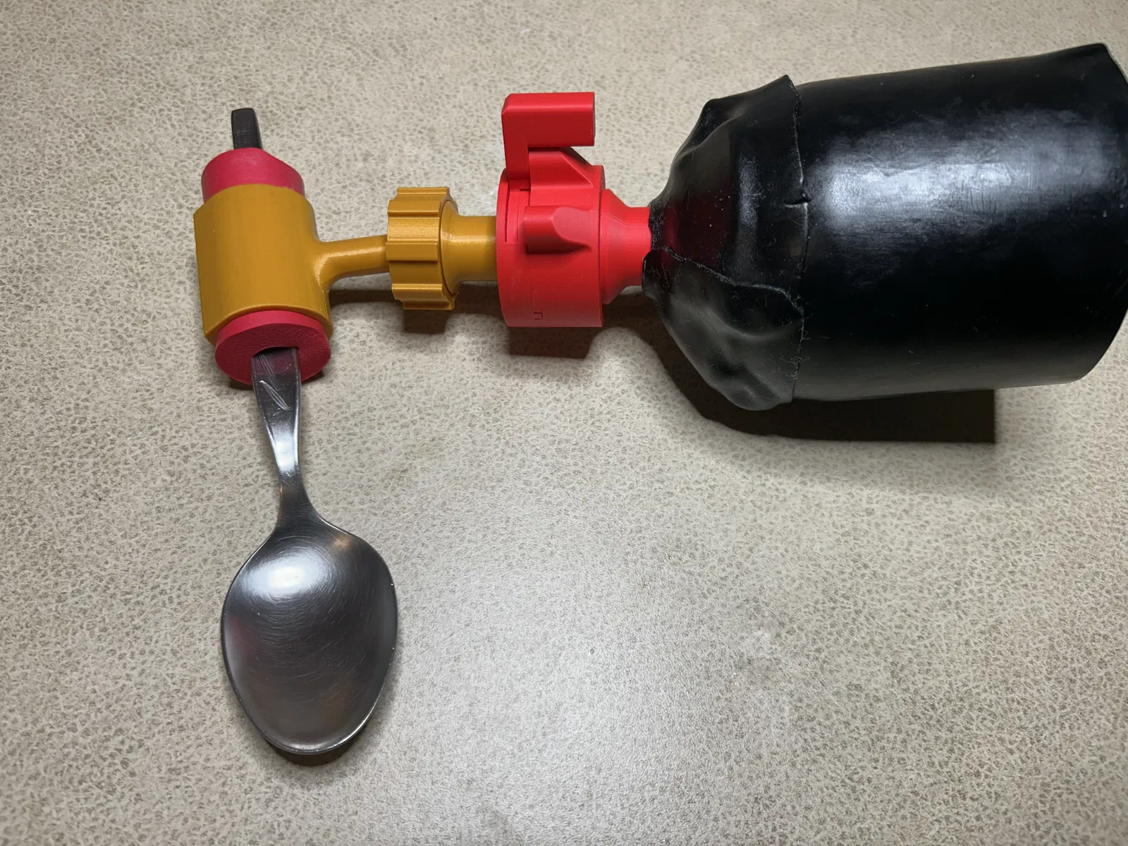 Bộ pre-prosthetic hỗ trợ sinh hoạt tạm thời sau cắt cụt bàn tay (trong lúc đang lành vết thương/ở bệnh viện). Dùng cho ăn uống, cầm stylus, bàn chải đánh răng… Có cơ chế khoá bằng nam châm.
