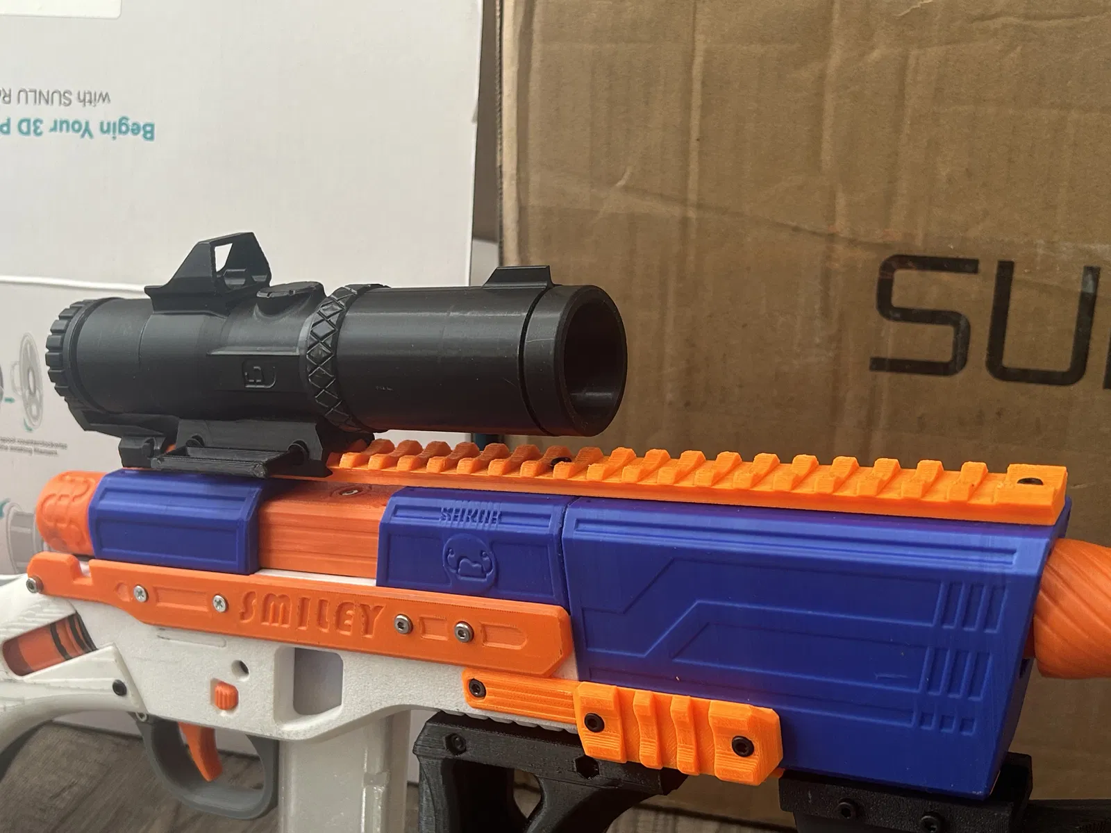 Bộ rail “Smiley - MAXIMUM RAIL” cho foam blaster/NERF. Cần handguard kéo dài, thêm ốc để gắn rail, và máy in tối thiểu ~220x220mm. Lưu ý bottom rail che luôn đáy receiver.