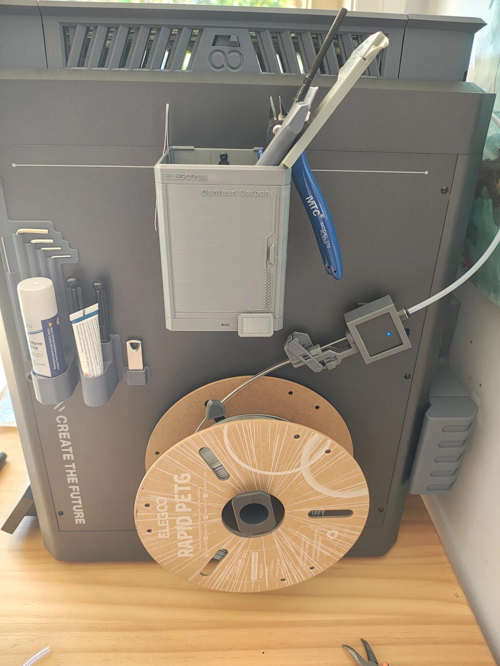 Bạn có thể dùng bản mod này ở bất kỳ vị trí nào trên hai bên thân máy in Elegoo, nơi có sẵn một lỗ vít 3mm của vỏ máy (case-screw) còn trống. Mình dùng nó làm hộp chứa đồ để cất kềm cắt (snips), nhíp, dũa, đèn khò (torch) và các dụng cụ/vật tư in khác. Chỉ một con vít vỏ máy là đã đủ chắc rồi.