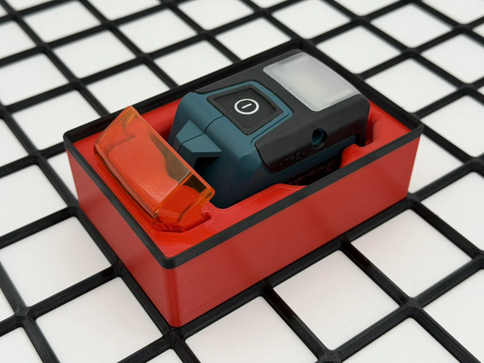 Khay bin này được thiết kế riêng để đựng đèn pin Makita CXT LED Flashlight (ML107) cho hệ Gridfinity của Zach Freedman. Có sẵn một khe để cất miếng orange diffuser đi kèm, và đèn vẫn đặt vừa trong bin ngay cả khi đang gắn diffuser.