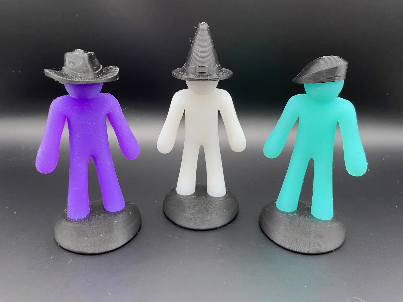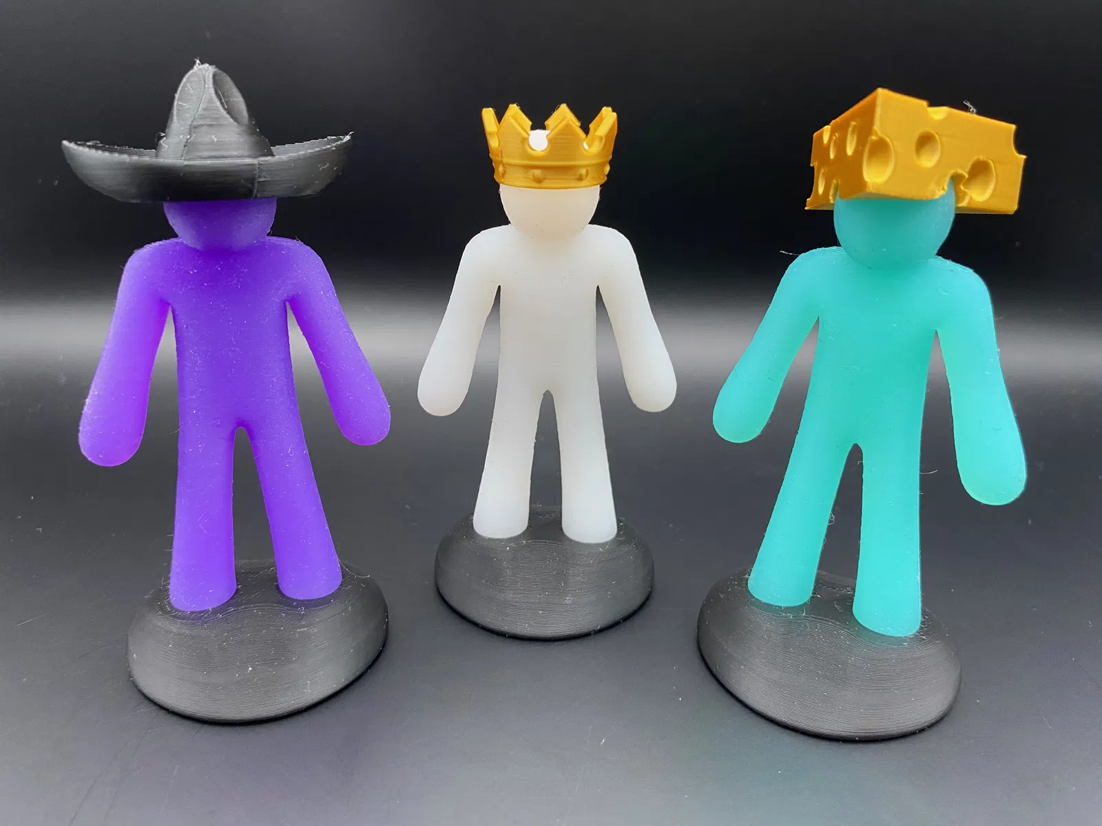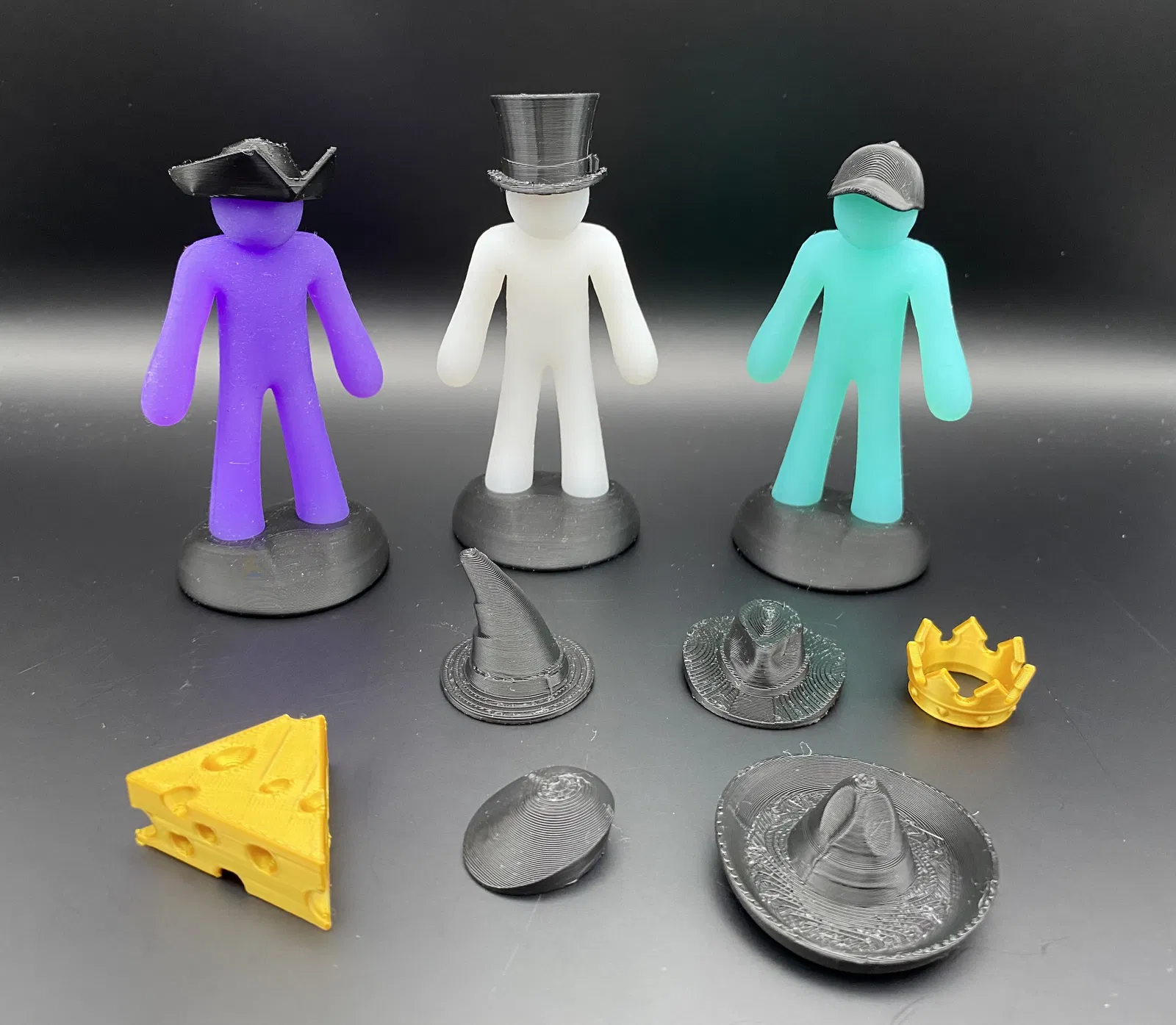 Bộ mũ “Hat Pack” dành cho The Flexy Stick Figure (stickman dẻo bằng silicone/TPU). In bằng PLA là được; vài mẫu cần supports (khuyên tree supports). Gồm Top Hat, Cowboy Hat, Cheese Hat; mũ Cap có thể cần brim.