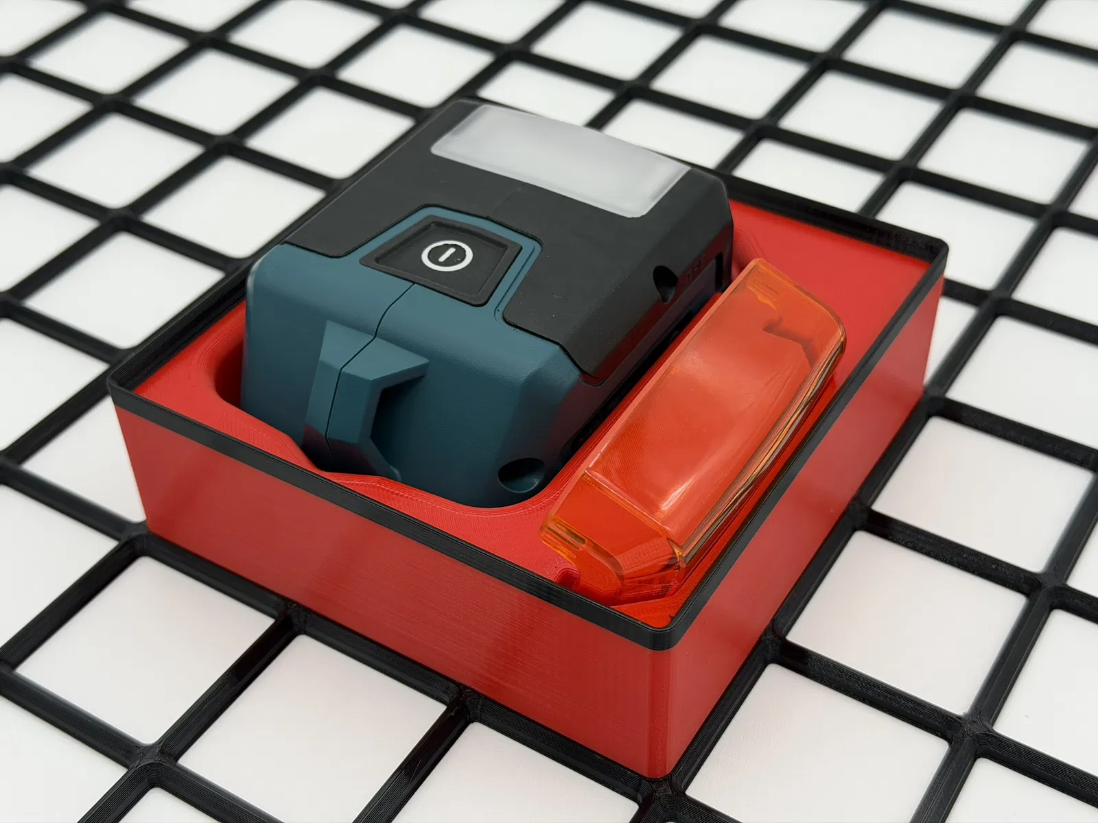 Hộp (bin) này được thiết kế riêng để đựng đèn pin Makita LXT LED Flashlight (DML817) cho hệ Gridfinity của Zach Freedman. Có một khe để cất miếng diffuser màu cam đi kèm, và cây đèn vẫn vừa trong bin ngay cả khi gắn diffuser.
