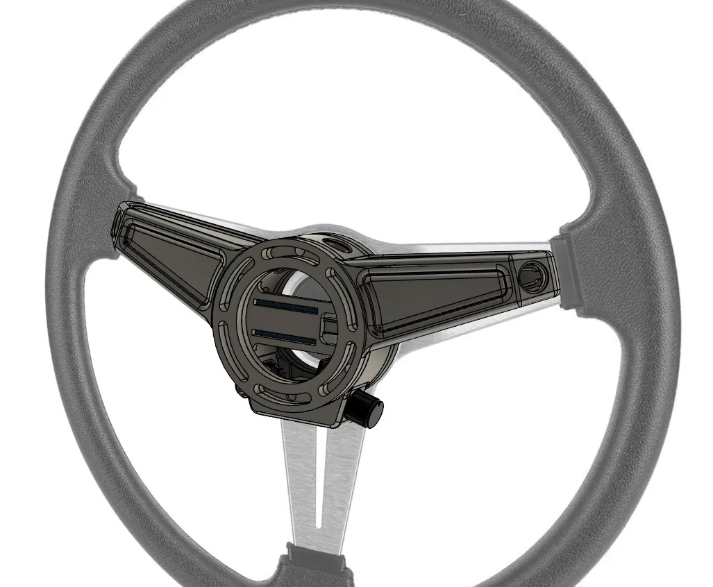 Mình thiết kế một wheel hub đơn giản, nhìn gọn gàng và “ẩn” phía sau vô lăng thể thao tiêu chuẩn nên không làm mất vẻ đẹp thanh thoát của vô lăng. Hai tay đòn bên trái và bên phải có thể xoay theo góc để canh theo loại vô lăng đang dùng hoặc vị trí bấm thuận tay nhất.