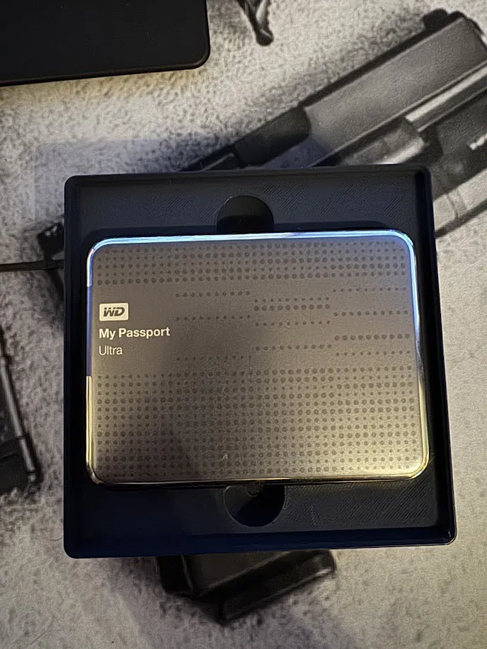 Khay lưu trữ tương thích Gridfinity cho WD My Passport Ultra, ôm khít ổ và có ngăn dưới để cất cáp USB gọn gàng. Giúp sắp xếp ngăn kéo sạch sẽ, dễ lấy ra nhờ rãnh móc ngón tay.