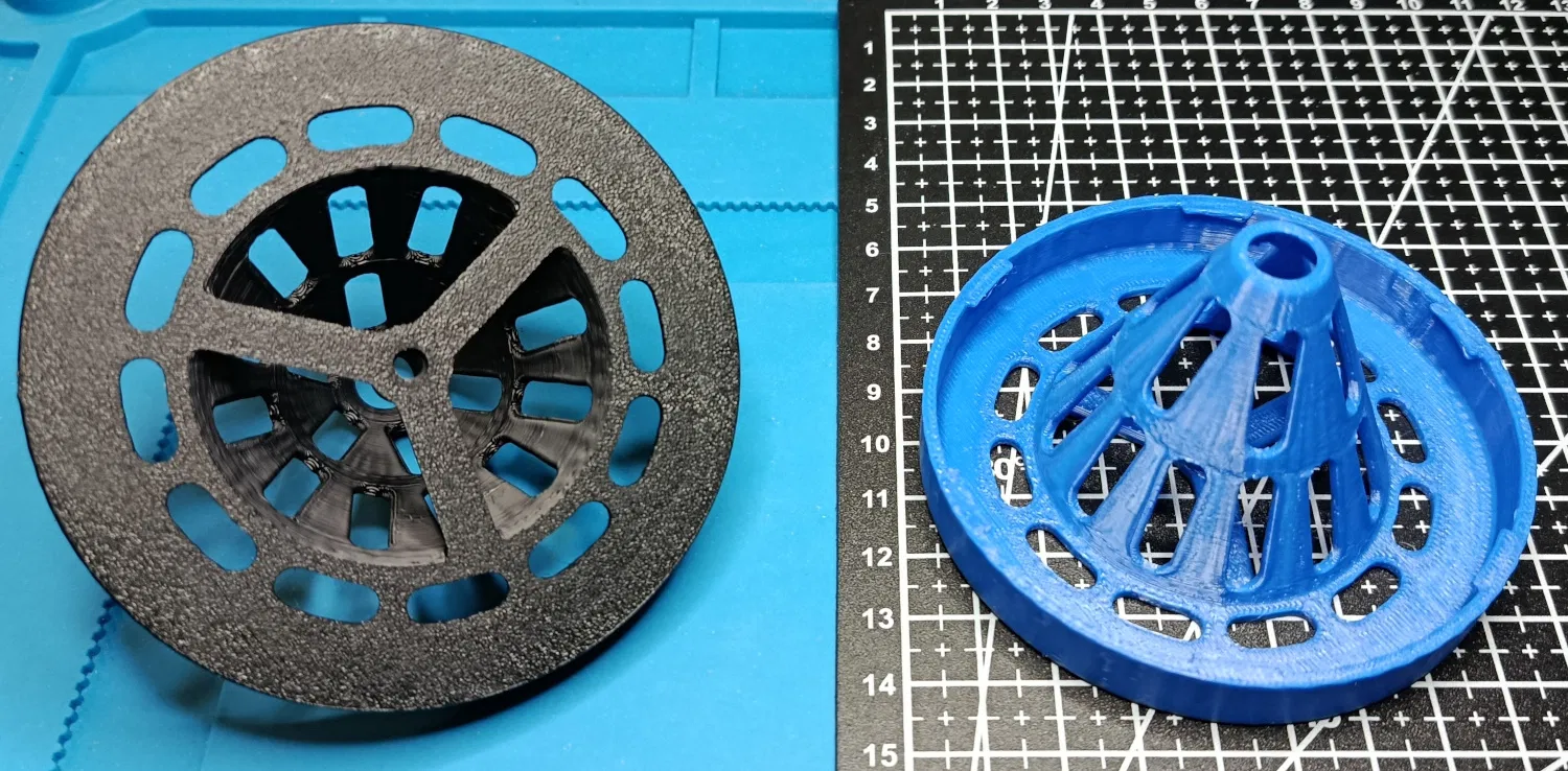 In bằng PETG (xanh) hoặc ASA (đen), nozzle 0.4mm, layer 0.2mm, không cần support.