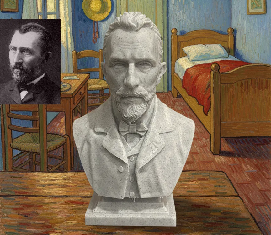 Mẫu tượng bán thân Vincent Willem van Gogh dựa trên bức ảnh được xem là đáng tin cậy nhất về diện mạo thật của ông. Phong cách điêu khắc cổ điển, giữ tỉ lệ, nét thô mộc và ánh nhìn hướng nội, tối ưu cho in 3D.