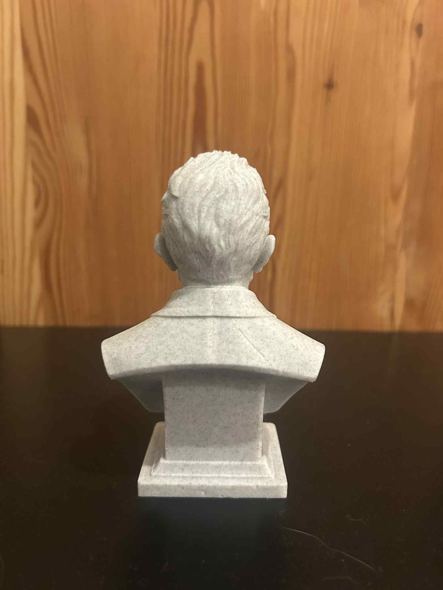 Cách diễn giải theo nguyên tắc tượng bán thân cổ điển: gương mặt ở vị trí chính diện với biểu cảm trung tính, tập trung và tỉ lệ được bảo toàn chính xác. Ánh mắt mãnh liệt, hướng nội phản chiếu chiều sâu tâm lý và sự căng thẳng nội tâm đã định hình cả cuộc đời lẫn sự nghiệp của ông. Những đặc điểm nổi bật — trán cao, mắt hơi sâu, mũi thẳng, bộ râu đầy và ria mép đậm — được thể hiện bằng các mảng khối mạnh và phần chạm khắc sâu, giúp tăng sức biểu đạt của tác phẩm.