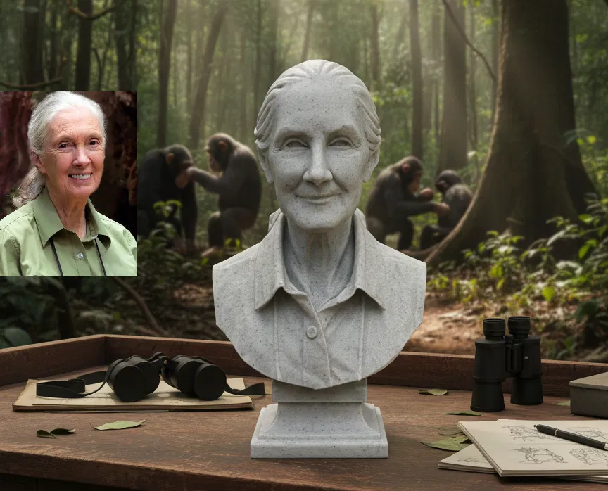 Bức tượng bán thân này khắc họa Valerie Jane Morris-Goodall, được biết đến rộng rãi với tên Jane Goodall—một biểu tượng của ngành linh trưởng học và công cuộc bảo tồn thiên nhiên hoang dã. Tác phẩm được lấy cảm hứng trực tiếp từ bức ảnh phổ biến và được lan truyền nhiều nhất của bà, hình ảnh đã góp phần định hình mạnh mẽ diện mạo công chúng của nữ khoa học gia trên toàn thế giới.
