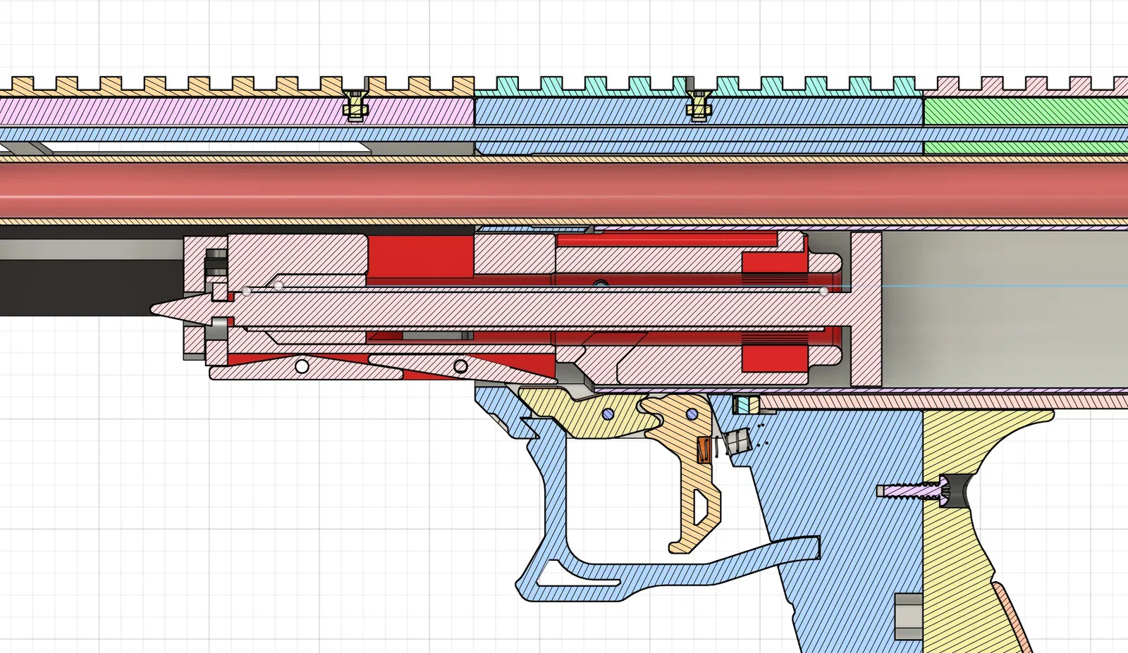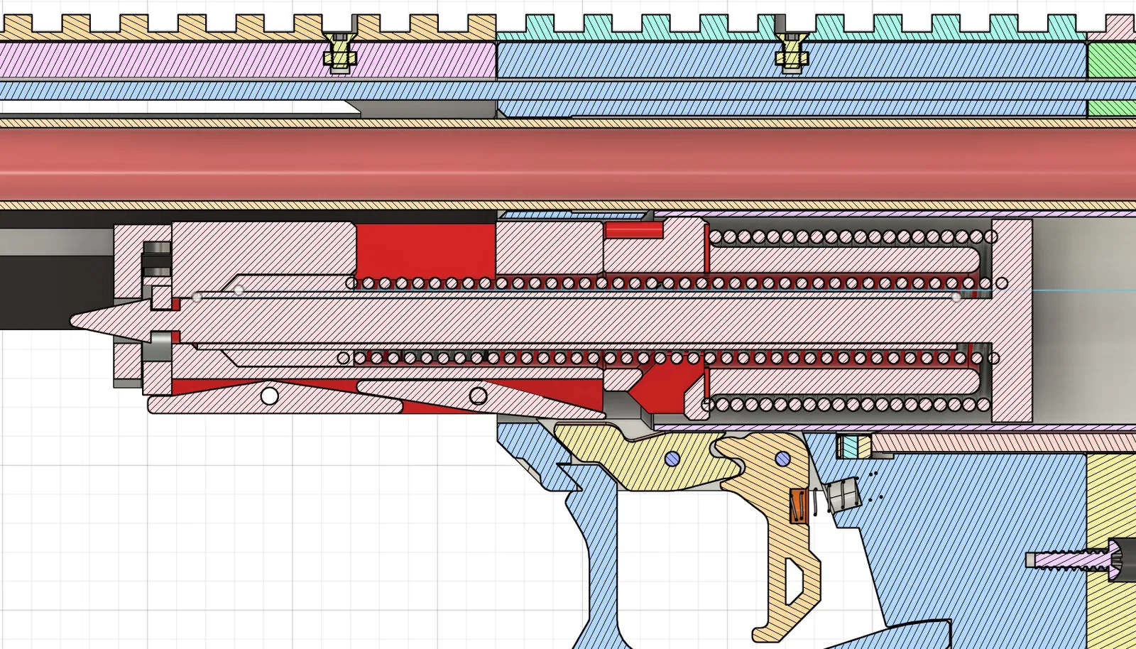 • Mặt sau của bệ lò xo có khả năng bị tách theo đường lớp in (layer lines) do phần lưng không được đỡ khi kéo quá tay (overdraw). Anh em có thể khoan lỗ trên thanh bar và catch 1 để bắt thêm ốc/chốt gia cố, hoặc chêm (shim) khoảng trống giữa khối pump và khối catch giống như trên cây Chibineko Lynx.