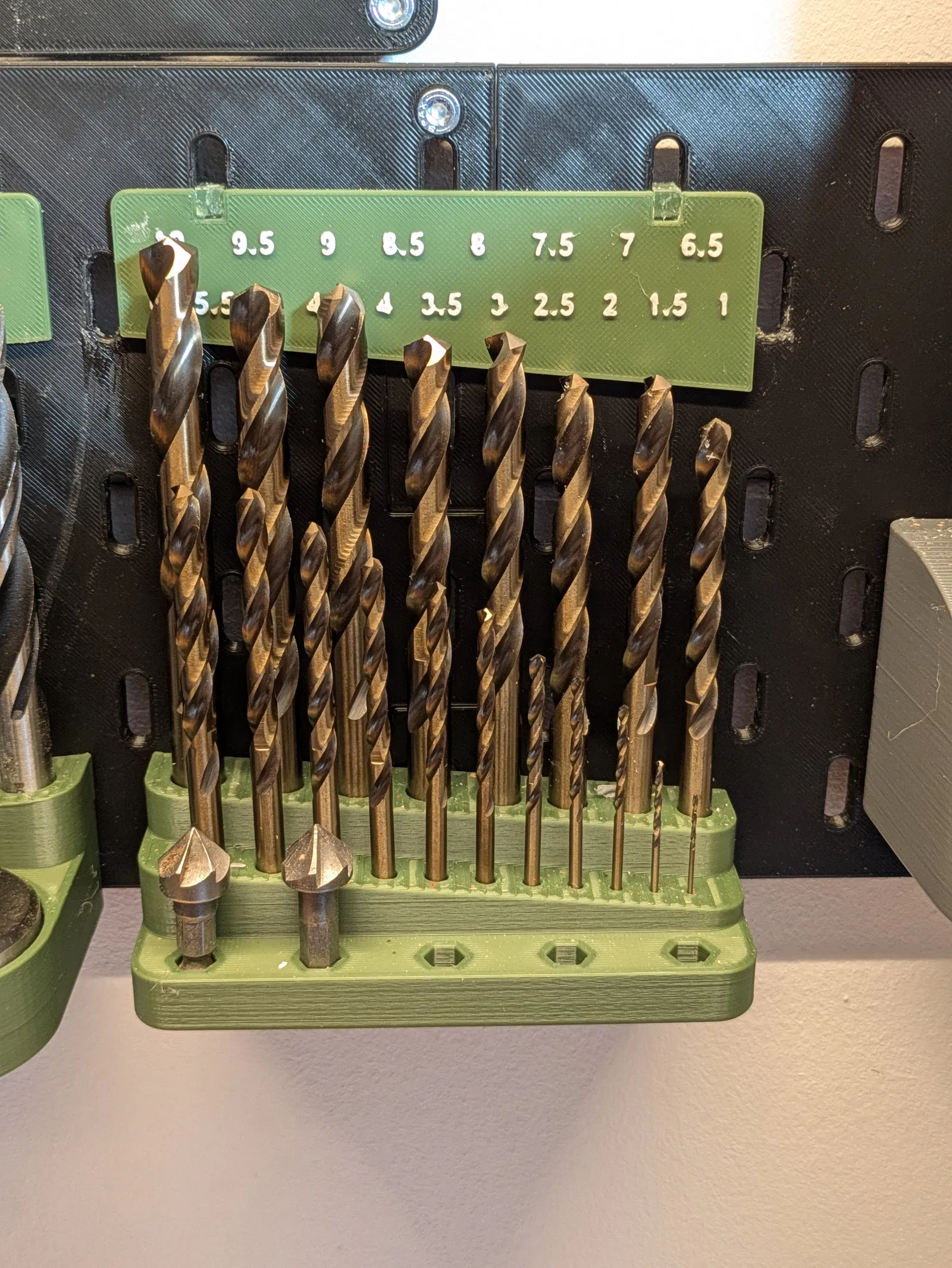 Giá đỡ mũi khoan kim loại gắn bảng IKEA Skadis, phù hợp mũi khoan từ 10mm đến 1mm theo bước 0,5mm. Thiết kế có thêm không gian để cất các đầu bits lục giác 1/4" gọn gàng, dễ lấy.