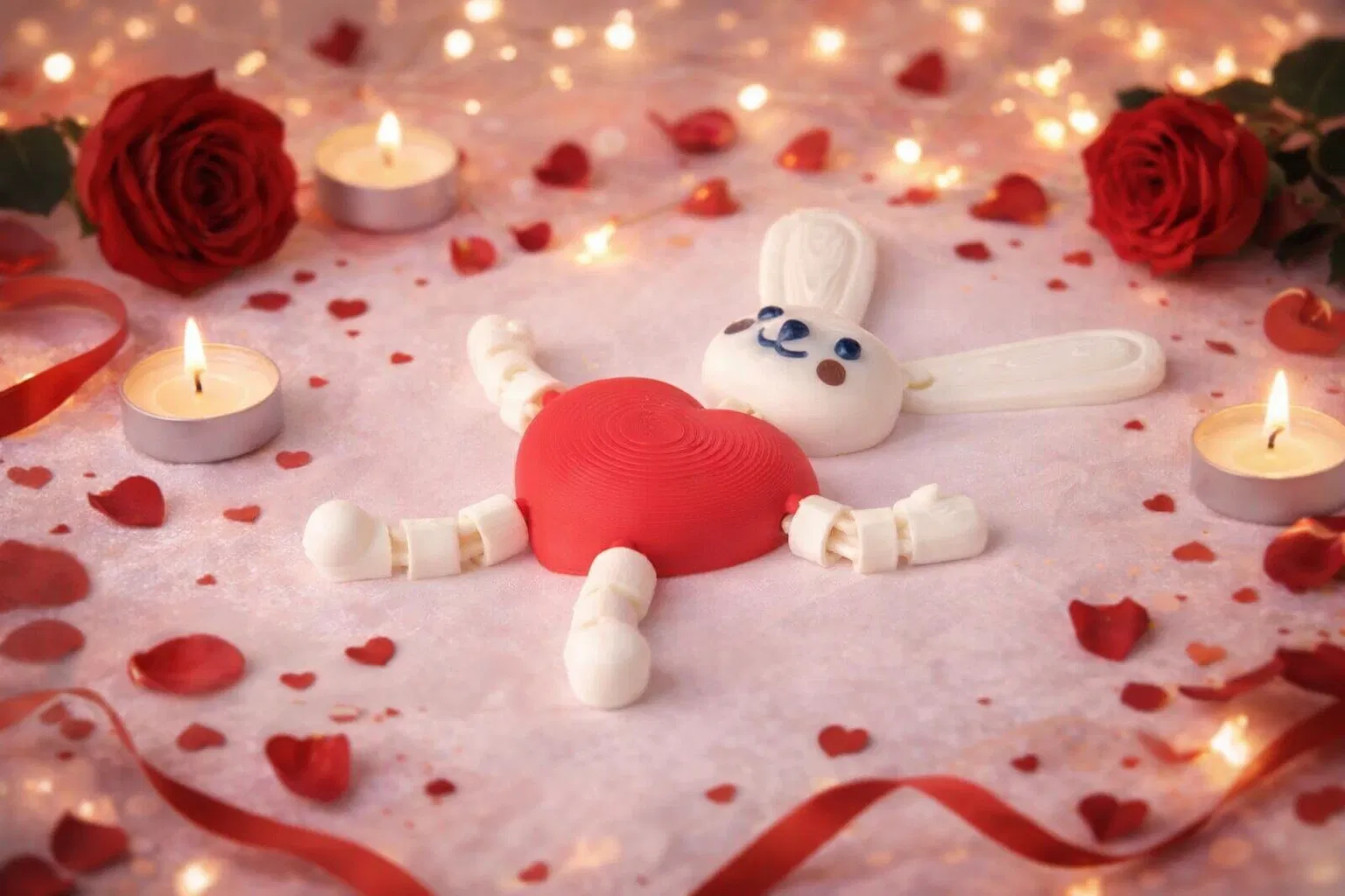 Mẫu đồ chơi thỏ khớp nối hình tim in 3D phong cách flexi: thân tim đỏ, tay chân trắng linh hoạt và tai thỏ. In nhựa matte liền khối, cử động mượt, hợp làm fidget toy, để bàn hoặc quà tặng Valentine.