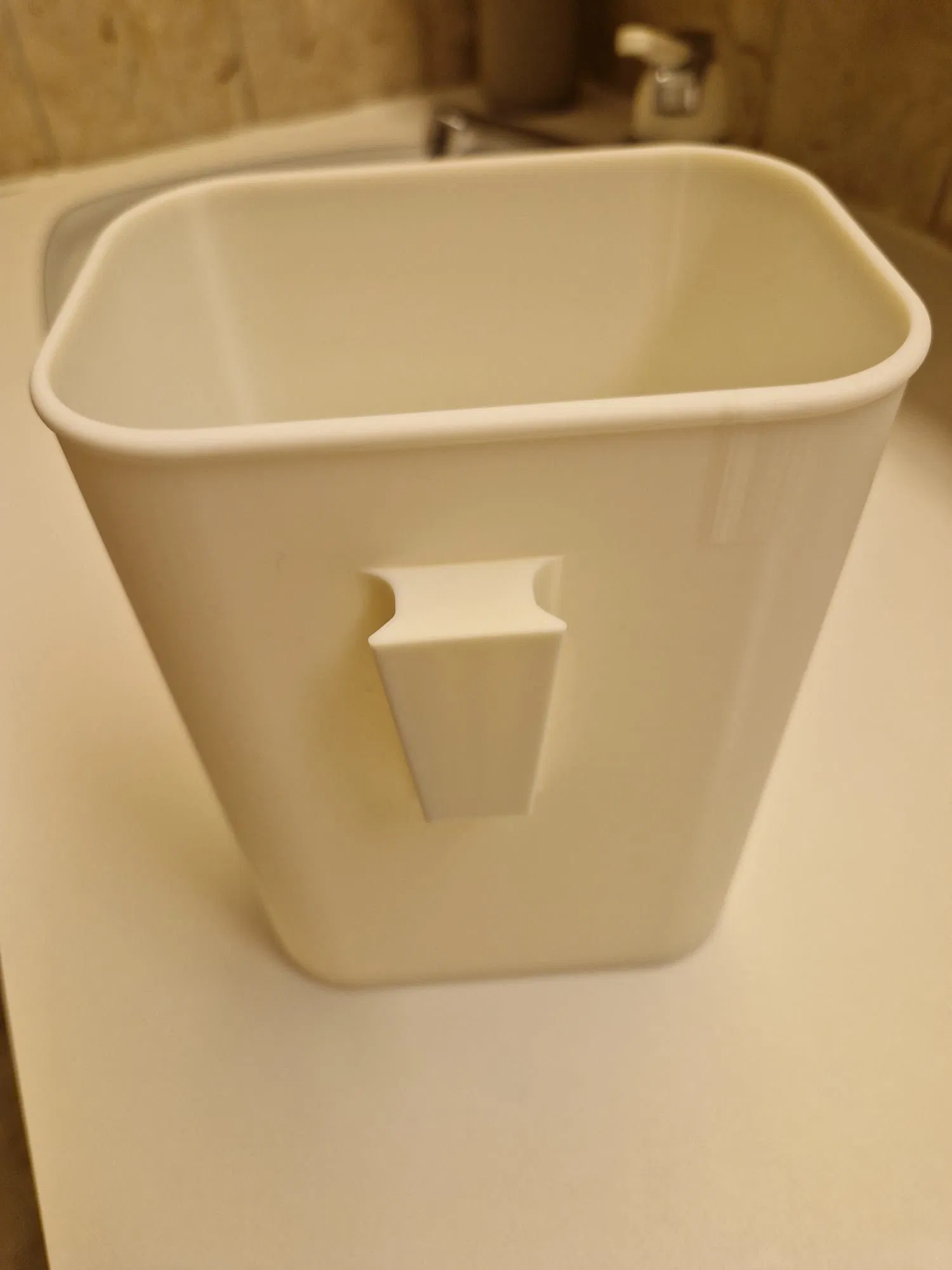 Thùng rác đơn giản tháo rời, phù hợp dùng trong phòng tắm. Kích thước 13×9×18 cm, dùng vừa túi nilon 2 lít. Gắn ngàm bằng băng keo 2 mặt; thùng trượt vào/ra dễ dàng.