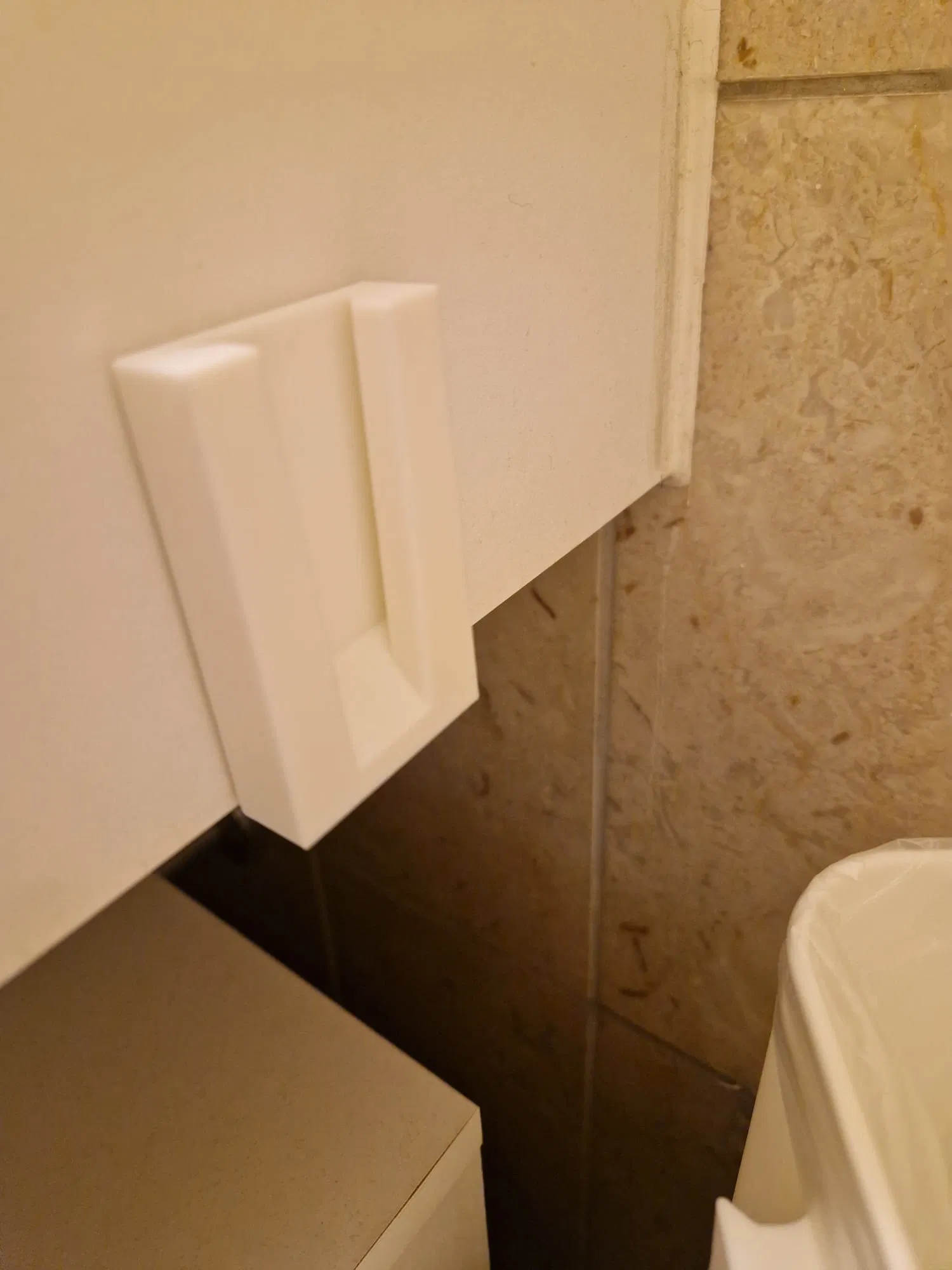 Gắn phần ngàm/đế treo bằng băng keo hai mặt. Thùng có thể trượt vào ngàm rất dễ và cũng tháo ra lại nhanh chóng. Phần ngàm cao 6.5 cm và rộng 4 cm.