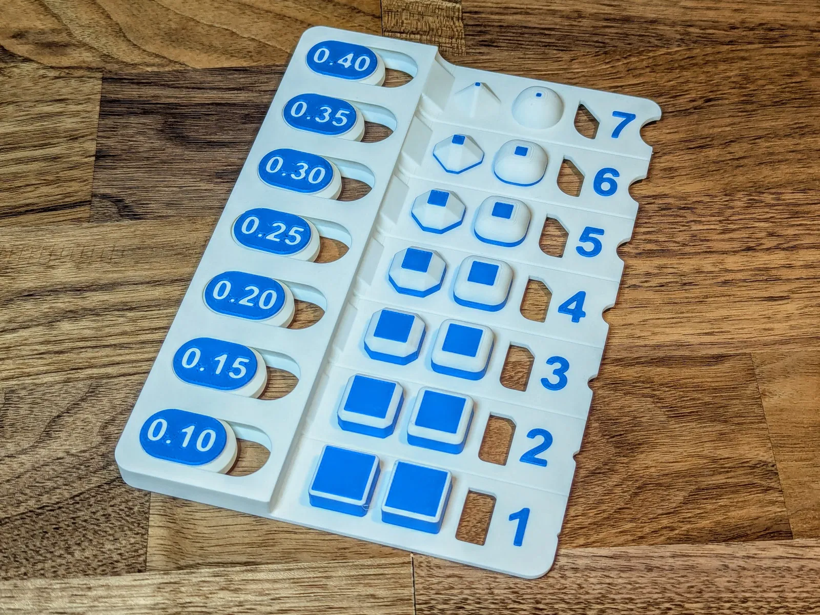 Mẫu gauge đo độ hở (clearance) dùng làm tham chiếu khi modeling, kèm ví dụ kích thước chamfer và bán kính fillet. Tất cả số đo theo mm; mức clearance thấp nhất có thể bị kẹt do quá nhỏ.