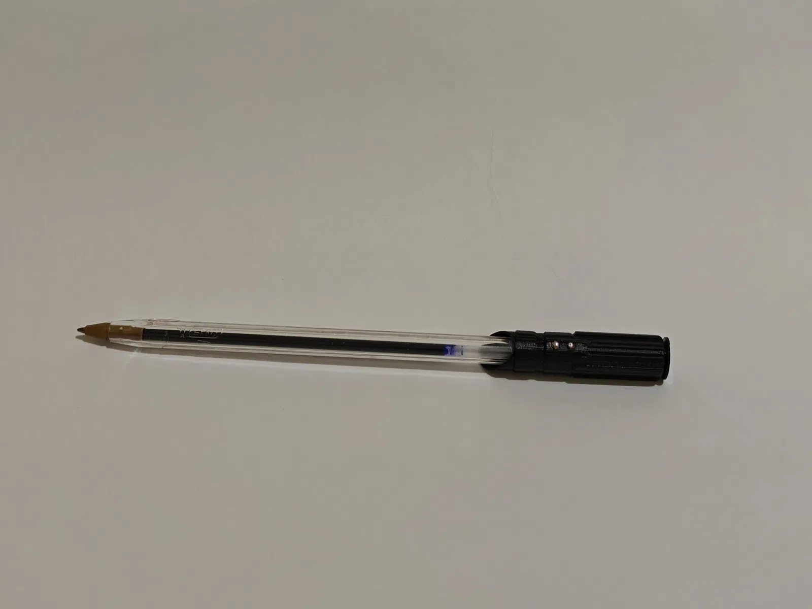 Mẫu nắp bút lightsaber in 3D có thể dùng được, lắp với ruột bút Bic Crystal và dùng pin LR726. Cần thêm transistor 2N3904 SOT23 cùng điện trở 0805 SMD để hoàn thiện mạch.