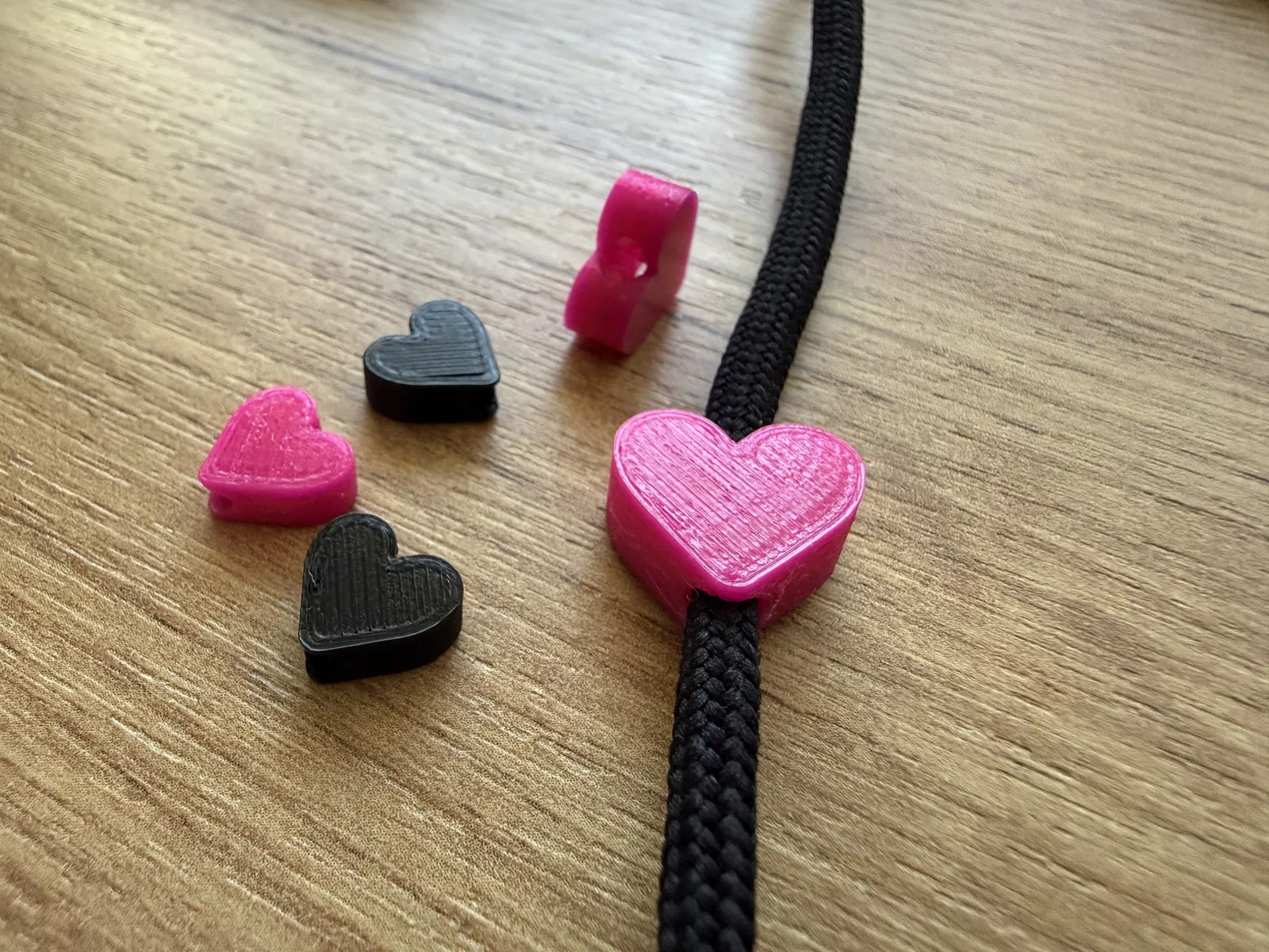 Hạt (bead) trang trí hình trái tim nhỏ để xỏ vào cord/drawstring/shoelace. Chỉ dùng làm điểm nhấn, không có chức năng khóa/chặn. In nhanh, không cần supports; hợp PLA hoặc PETG, đẹp nhất màu đỏ/hồng.