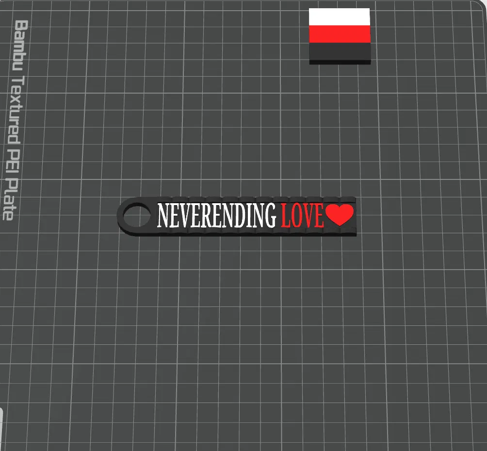 Móc khóa “Neverending Love” nhỏ gọn, phù hợp làm quà tặng Valentine. Bạn có thể tùy chỉnh phối màu khi in; mình thực hiện bằng Kantenerkennung (nhận diện cạnh) để tách phần chữ và viền.
