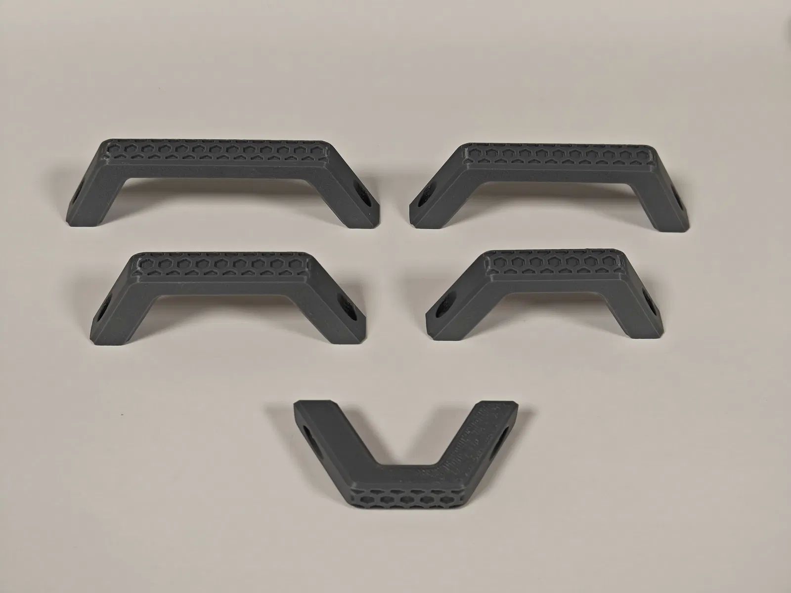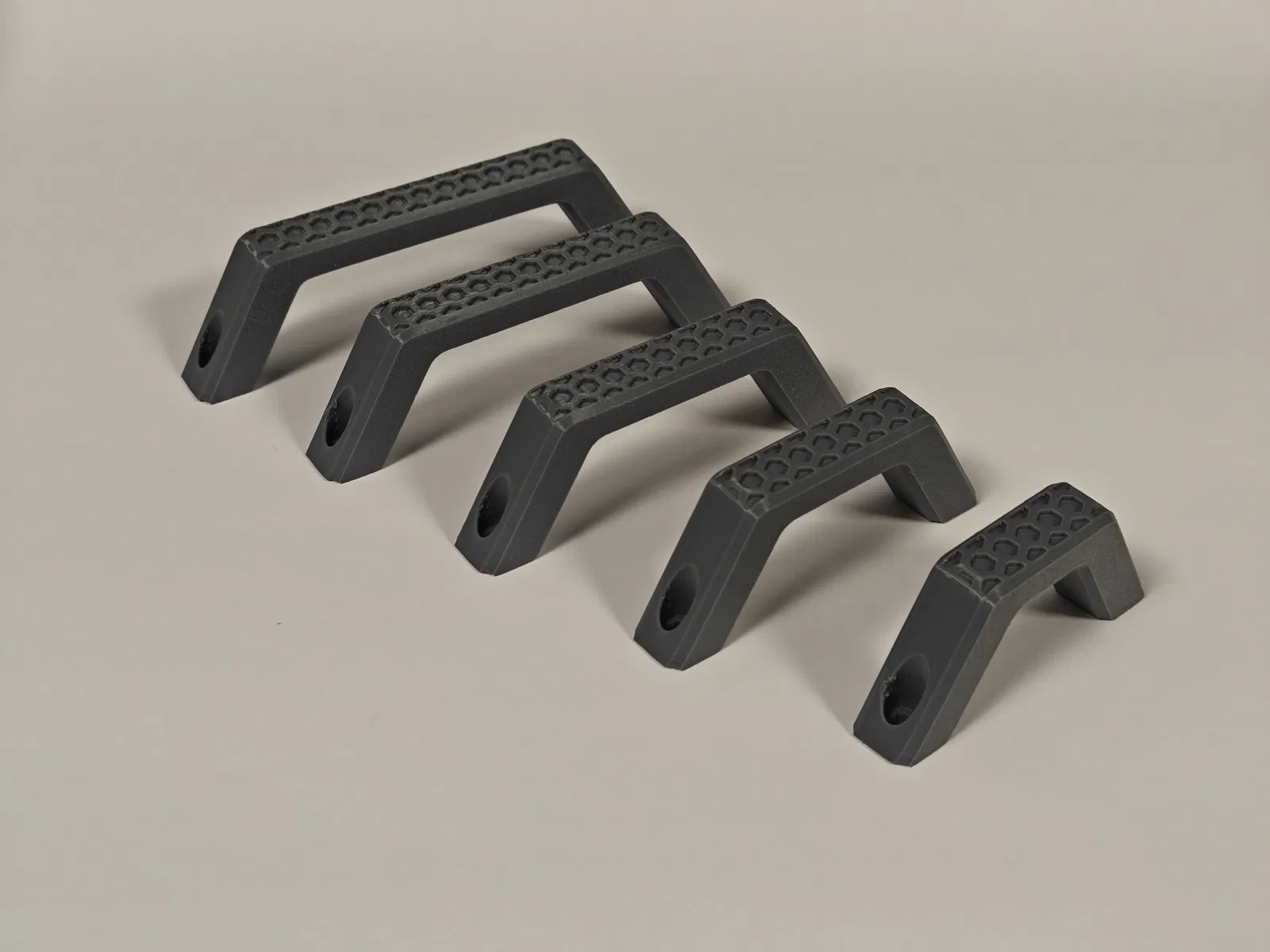 Bộ tay nắm tủ/ngăn kéo hoạ tiết lục giác hiện đại, bắt sáng đẹp và nhìn sang. Có ngàm bắt ốc M3, gồm 5 khoảng cách lỗ 50/60/70/80/90 mm. In PLA được, khuyên PETG/ASA cho bếp.