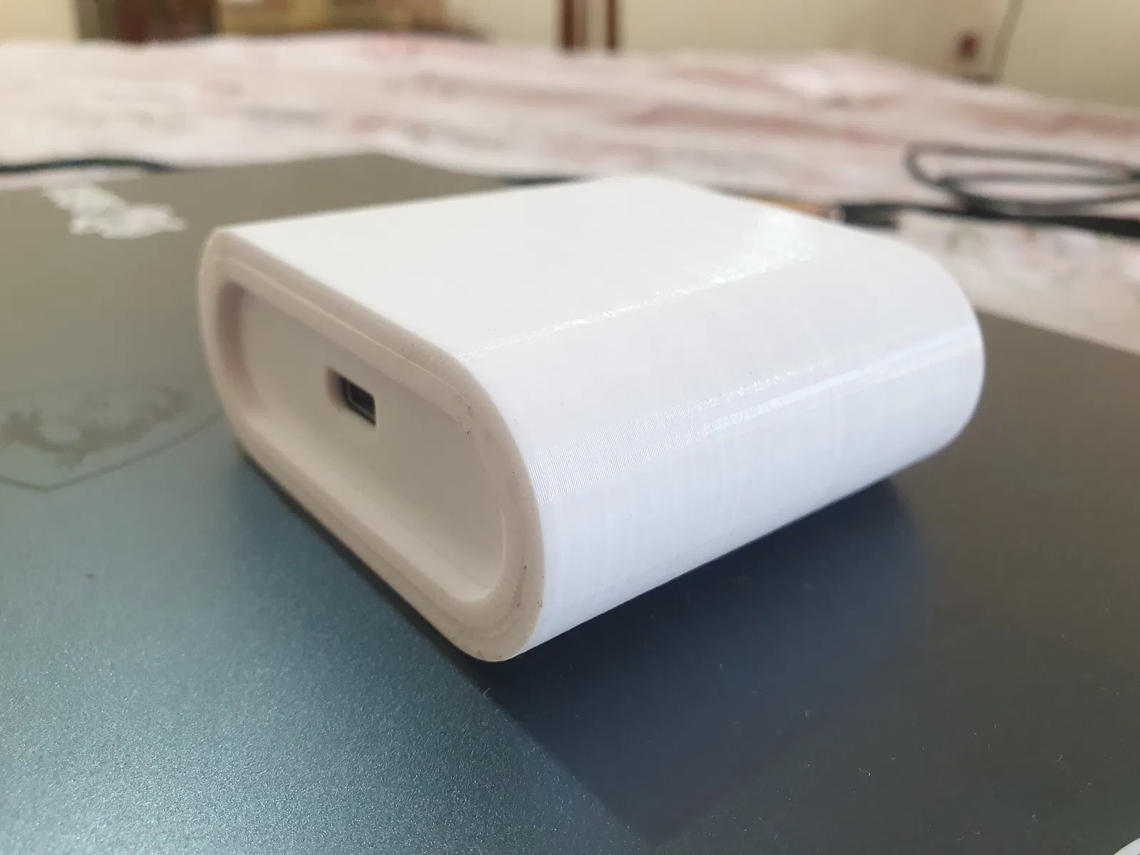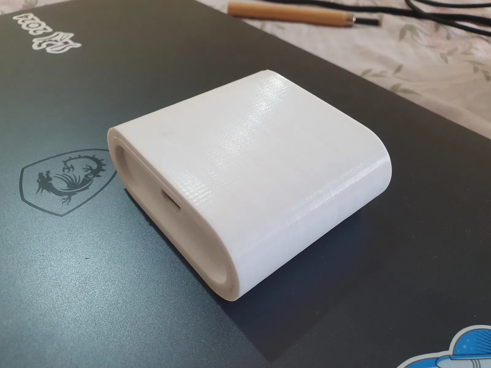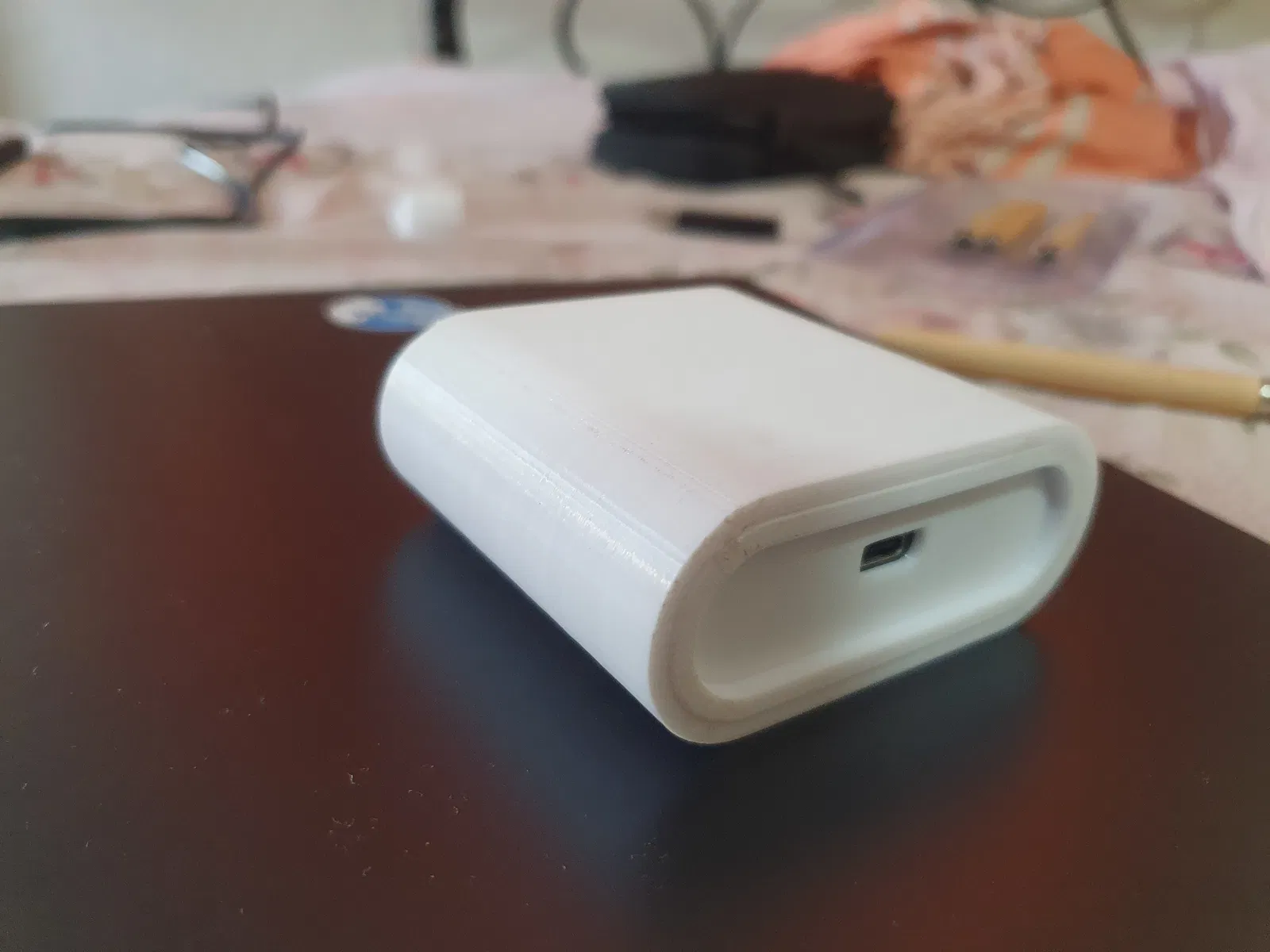 Enclosure/casing tuỳ chỉnh để bọc mạch sạc điện thoại (từ sạc Samsung 25W bị hư). Sau khi thay capacitor bị nổ cho mạch hoạt động lại, mẫu vỏ này giúp che chắn an toàn hơn, giảm nguy cơ điện giật. Thiết kế bằng Fusion 360.