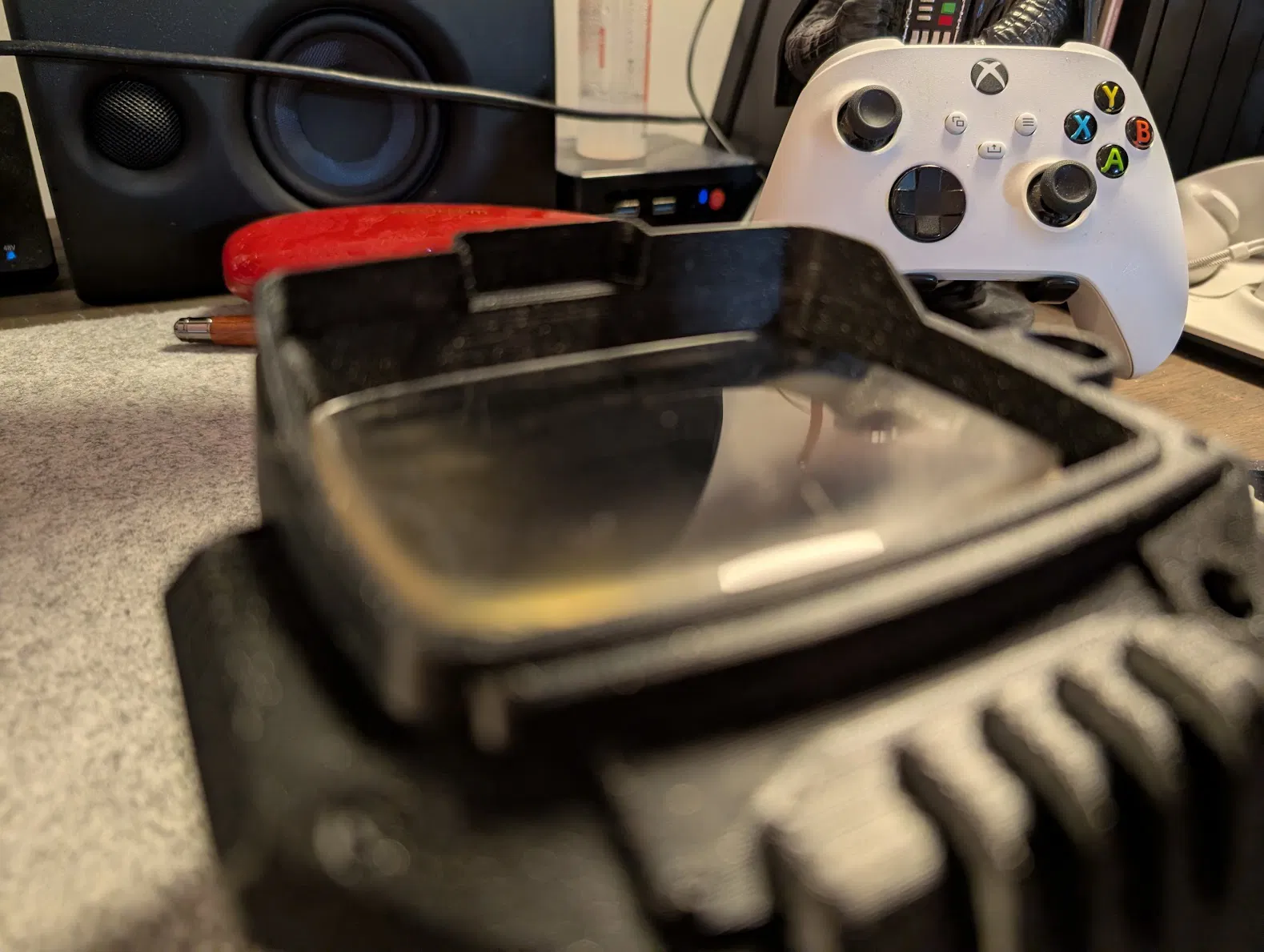Thấu kính giúp màn LCD phẳng trông giống CRT đúng chất cho Pipboy 3000 (model của jeje95). Khuyến nghị in resin, rửa IPA, cure, chà nhám tới 2000 grit rồi phủ clear coat và polish để đạt độ trong như kính.