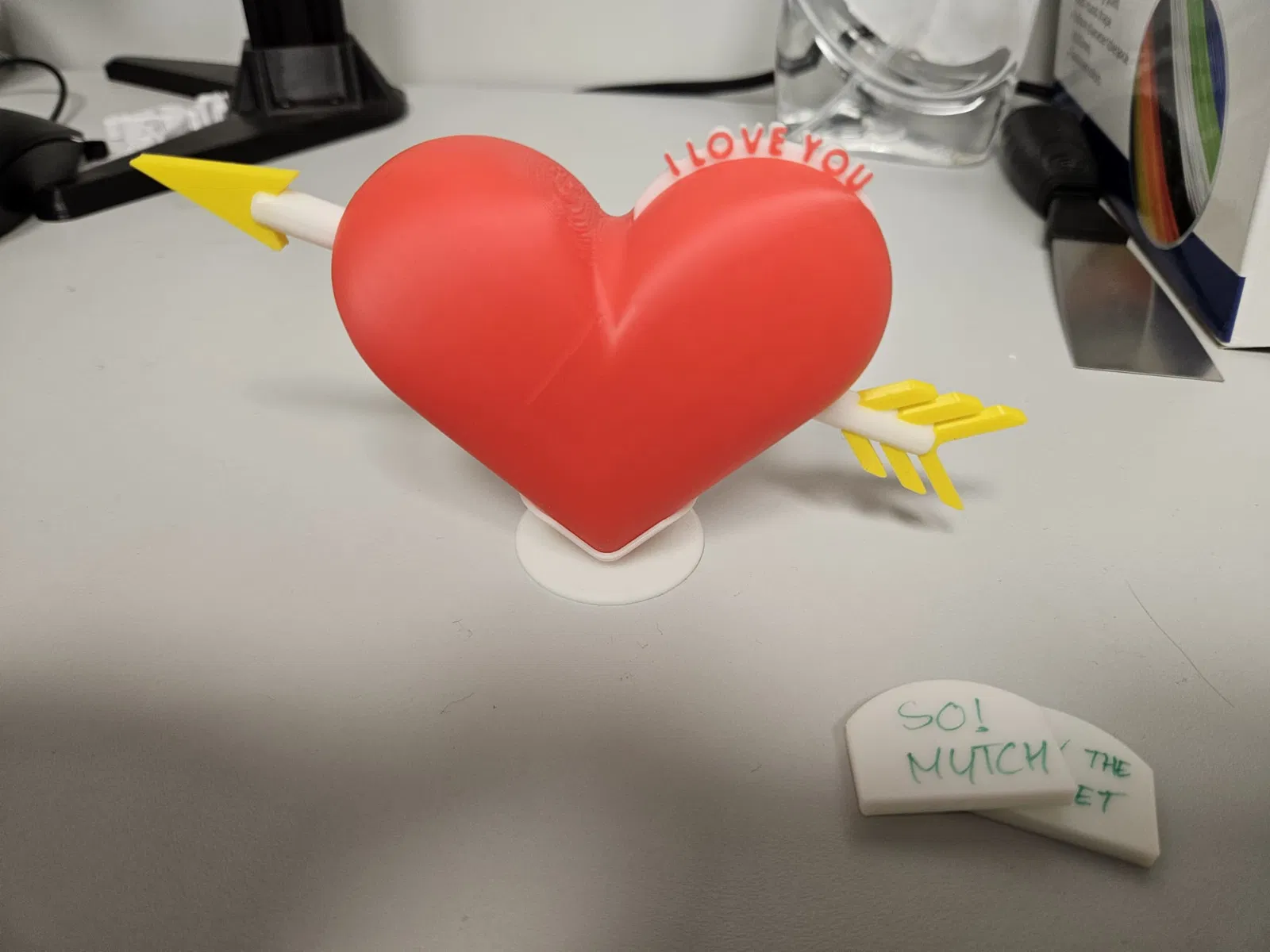 Tác phẩm điêu khắc cơ khí được tạo riêng cho Ngày Valentine, in 3D bằng tất cả sự yêu thương. Một trái tim đang chờ mũi tên của mình — và khoảnh khắc mũi tên chạm đến, một logo ẩn sẽ bật lên nhẹ nhàng, như một lời tỏ tình bí mật bỗng hóa thành thật.