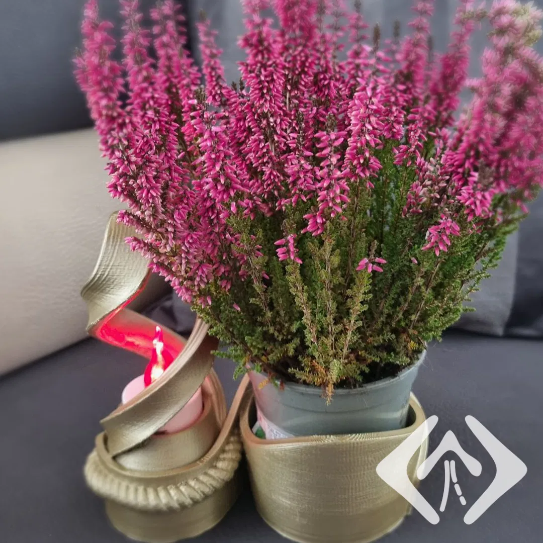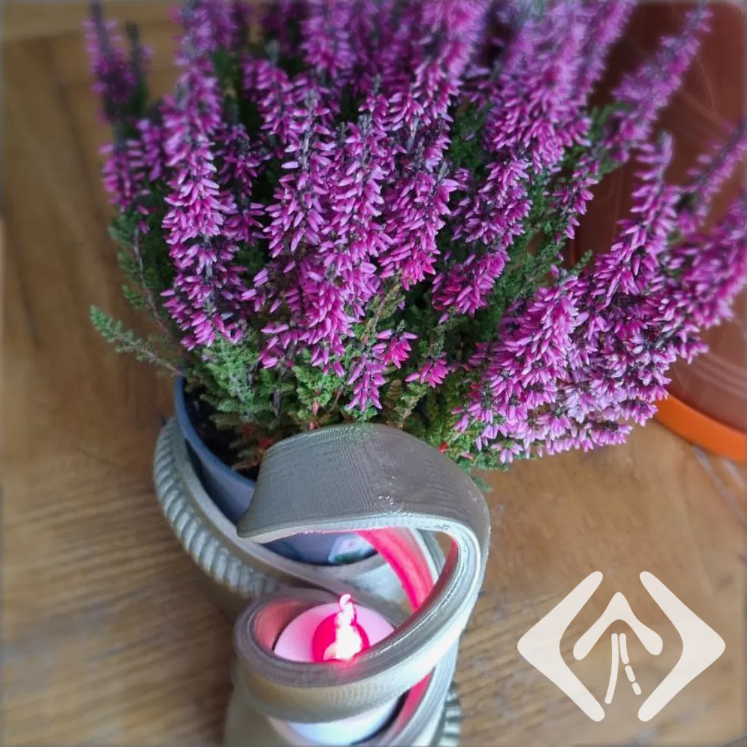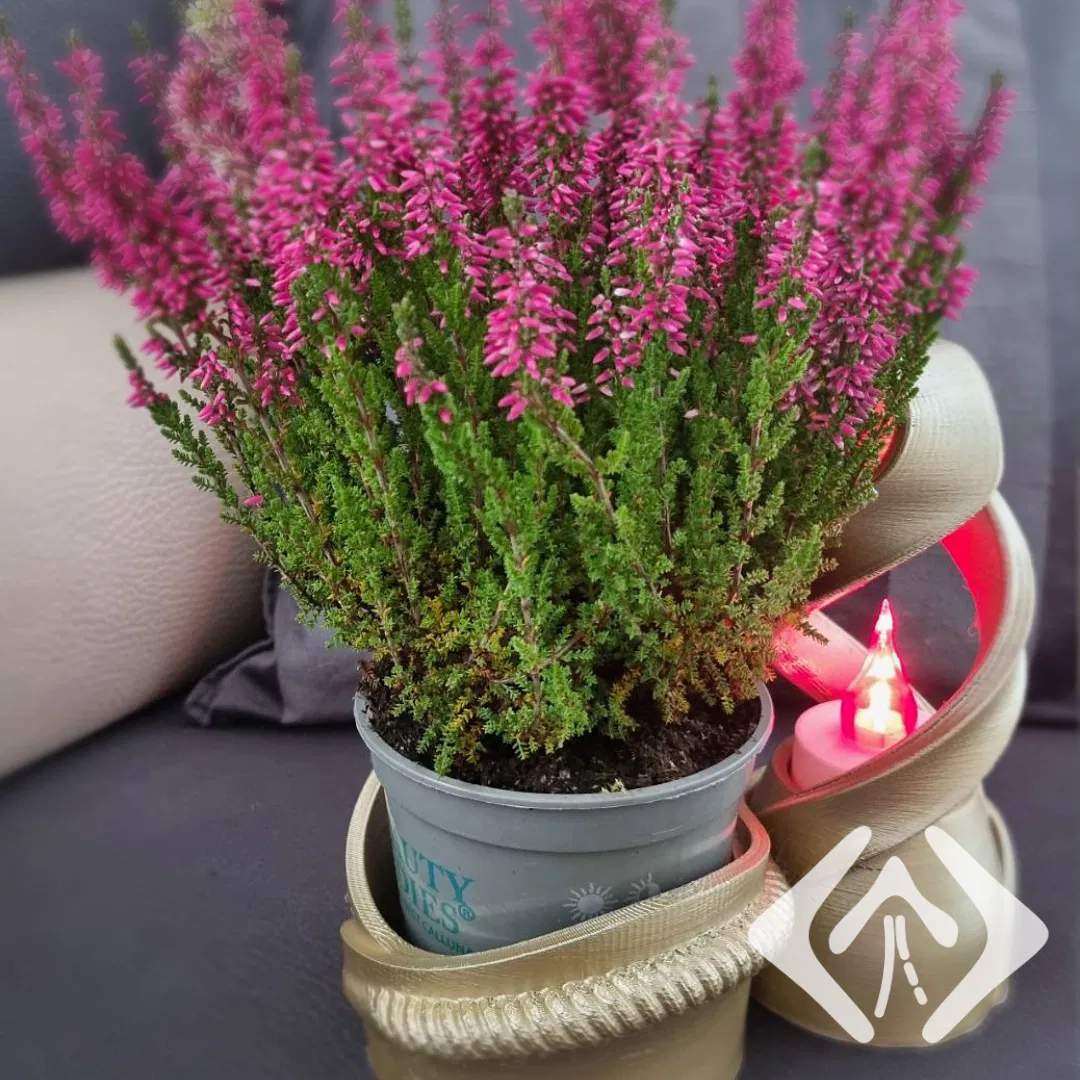 Chậu cây dạng xoắn và giá đỡ nến LED được thiết kế để 3D printing với tree supports giúp in dễ hơn và bề mặt sạch hơn. Vừa các chậu cây đường kính tối đa 104 mm và nến LED đường kính tối đa 46.6 mm. Nến LED được lắp từ phía dưới bằng một nắp vặn (screw cap) để thay thế dễ dàng mà không cần tháo cả món. Tree supports giúp tiết kiệm vật liệu và thời gian in, đồng thời dễ gỡ hơn và để lại ít vết trên bề mặt.