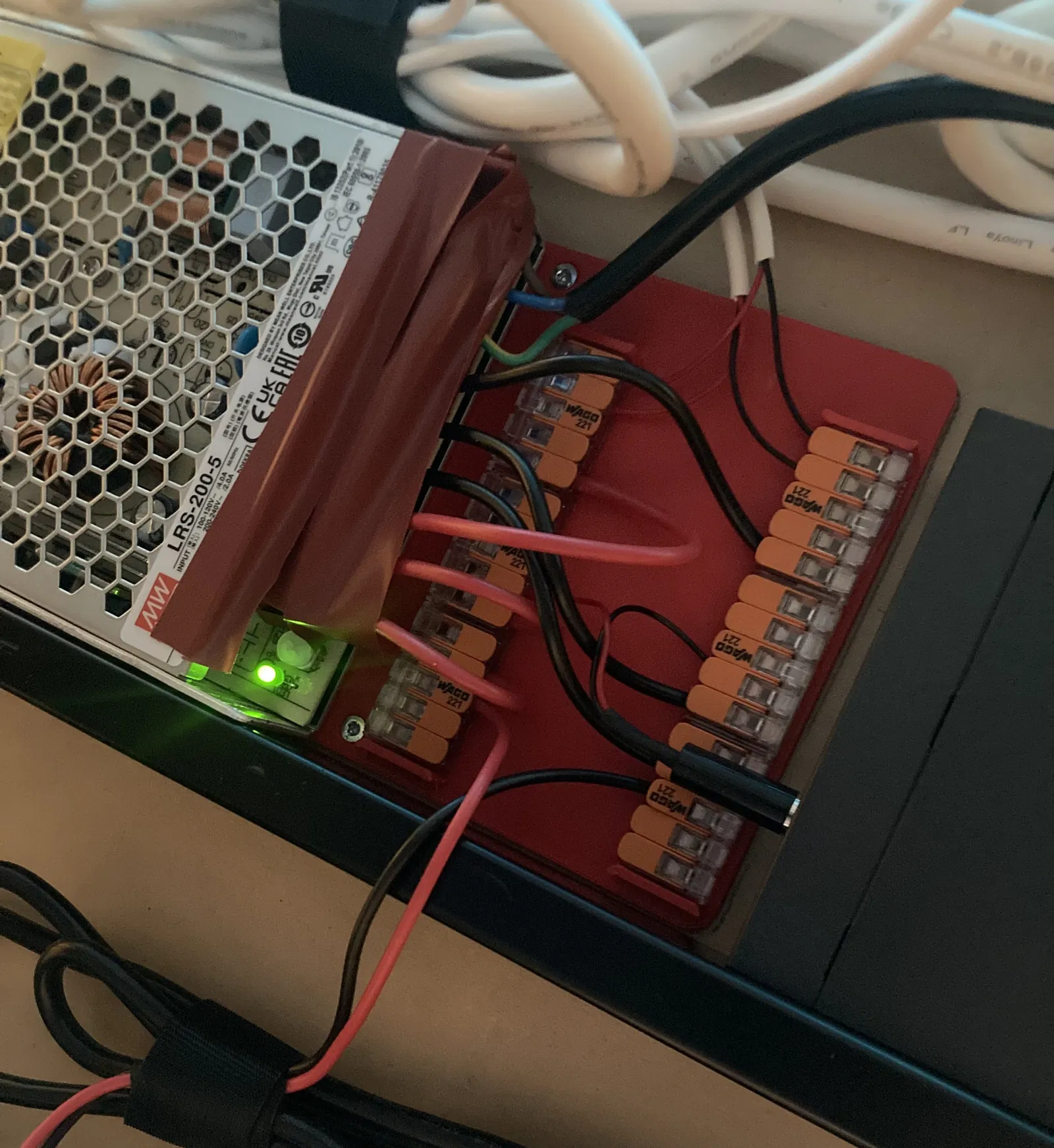 Bracket gắn low-profile cho PSU MeanWell LRS-200-5. Lỗ bắt vít đối xứng nên cần in 2 cái mỗi PSU. Có bản mở rộng để gắn thêm Wago connector 221-series (5 pin) cạnh terminal.