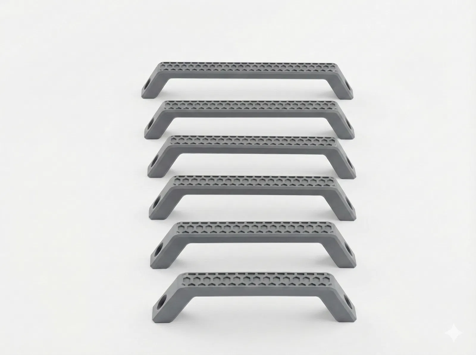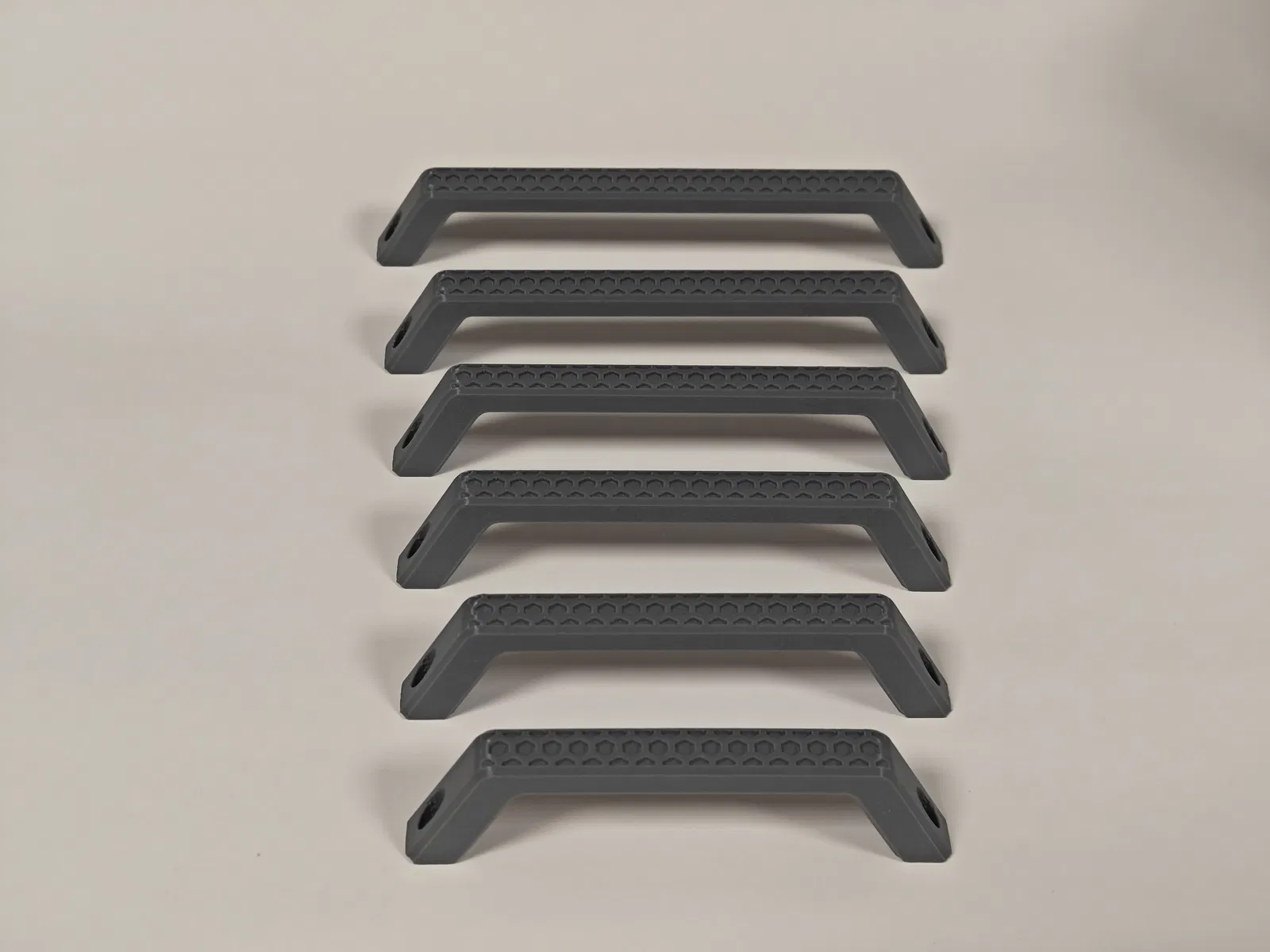 Bộ tay nắm tủ/ngăn kéo họa tiết lục giác hiện đại cho nội thất cỡ lớn. Hỗ trợ ốc M3, 6 cỡ khoảng cách lỗ 100–150mm. Gợi ý in: PLA ổn, PETG/ASA phù hợp bếp; infill 20–30%, 3 perimeters.