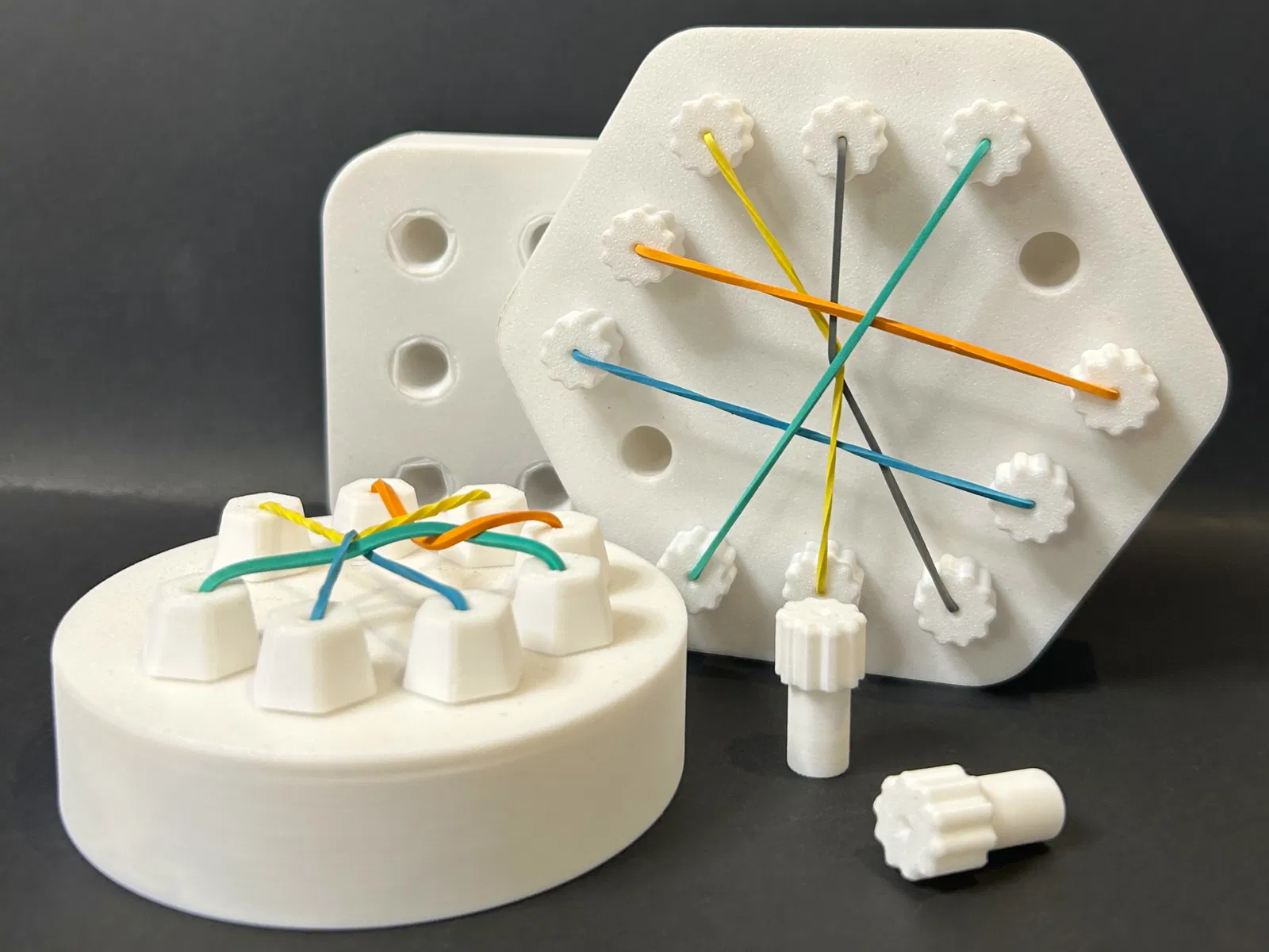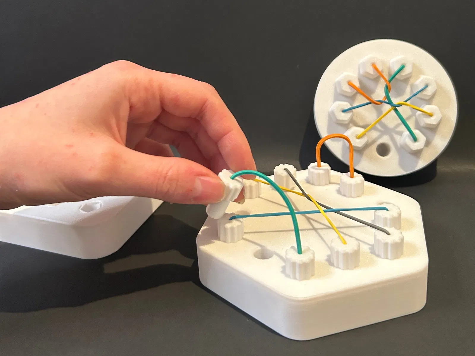 Puzzle in 3D Tangle Rope: in board và pin, dùng dây thun văn phòng để gỡ rối. Nhiều kiểu board/pin cho độ khó gần như vô hạn. Gọn, rẻ, hợp cho trẻ em tới người lớn, giúp xả stress và luyện tư duy.