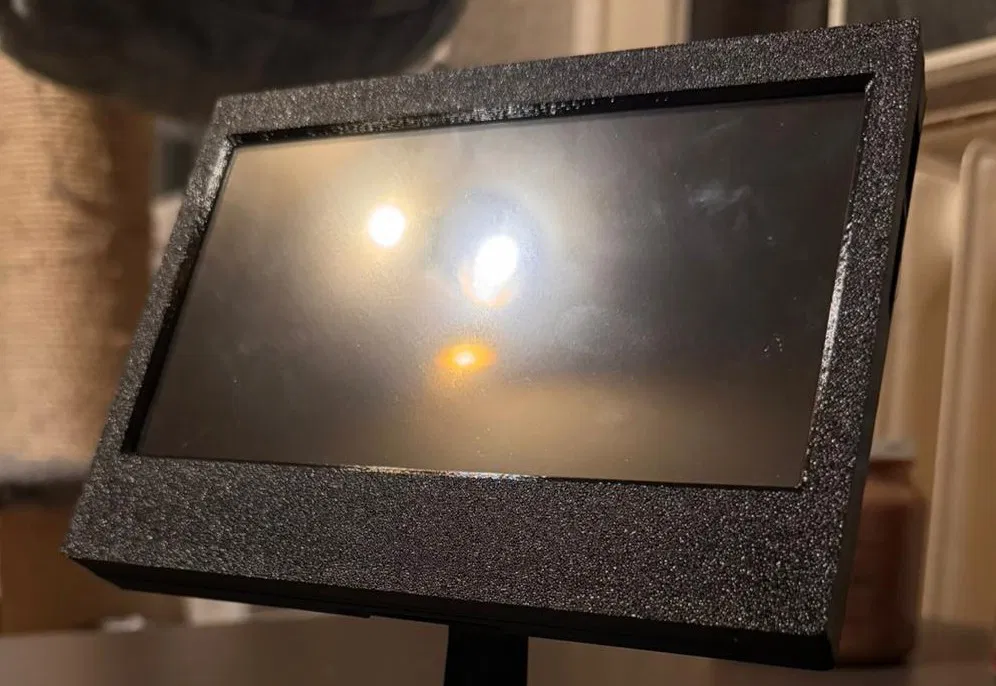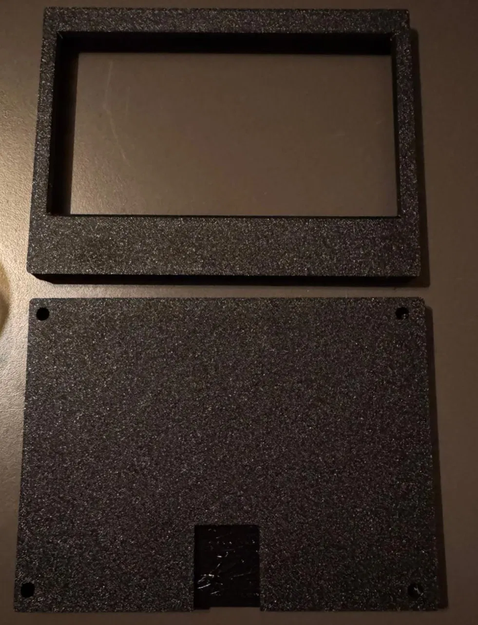 Vỏ (display case) cho màn hình 7" dùng cho khung/cage máy quay. In bằng PETG, có chỗ lắp M4 threaded insert. Màn hình hiện bắt bằng ốc; mặt sau có khe trượt để gắn tay đỡ khớp (có thể bỏ theo yêu cầu).