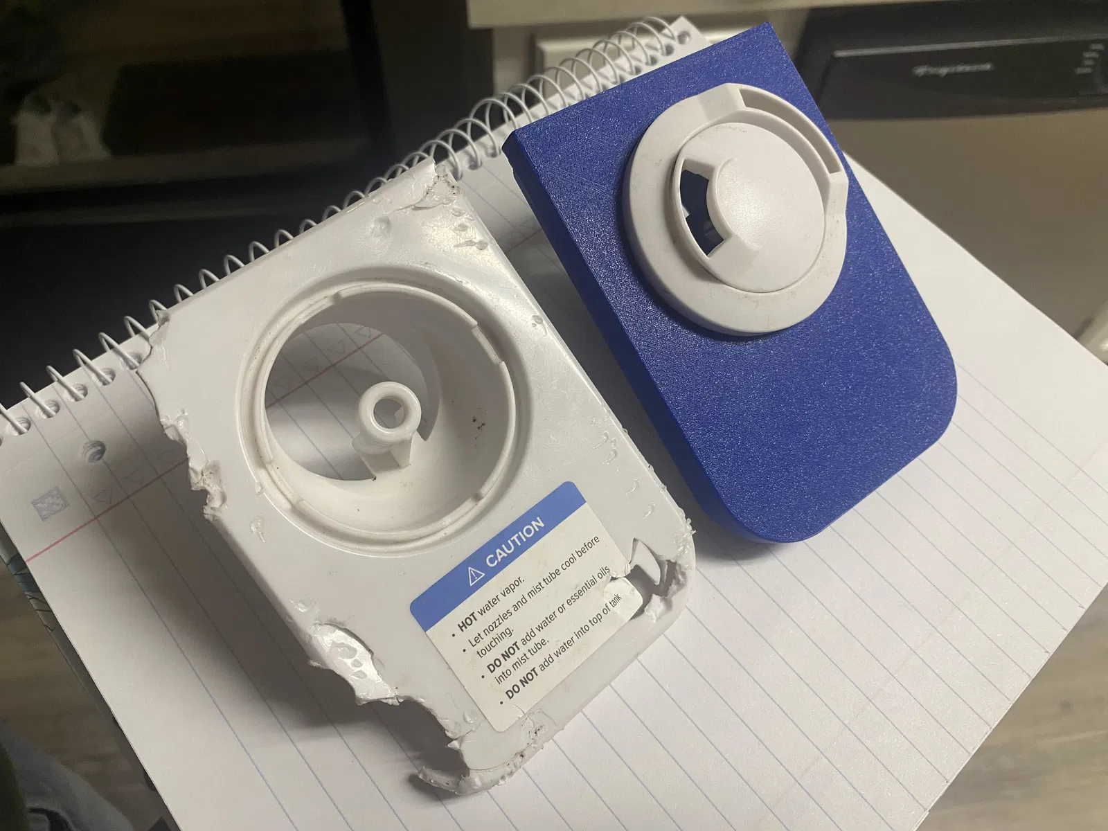 Mình in lộn ngược và dùng supports cho phần ở giữa. Mình dùng PETG. Lưu ý là máy tạo ẩm này có chế độ heat nên luồng khí có thể nóng, và PETG có thể bị biến dạng ở nhiệt độ hơi nước.