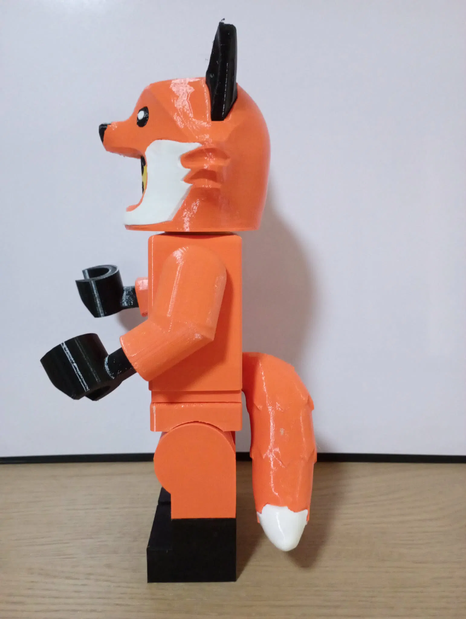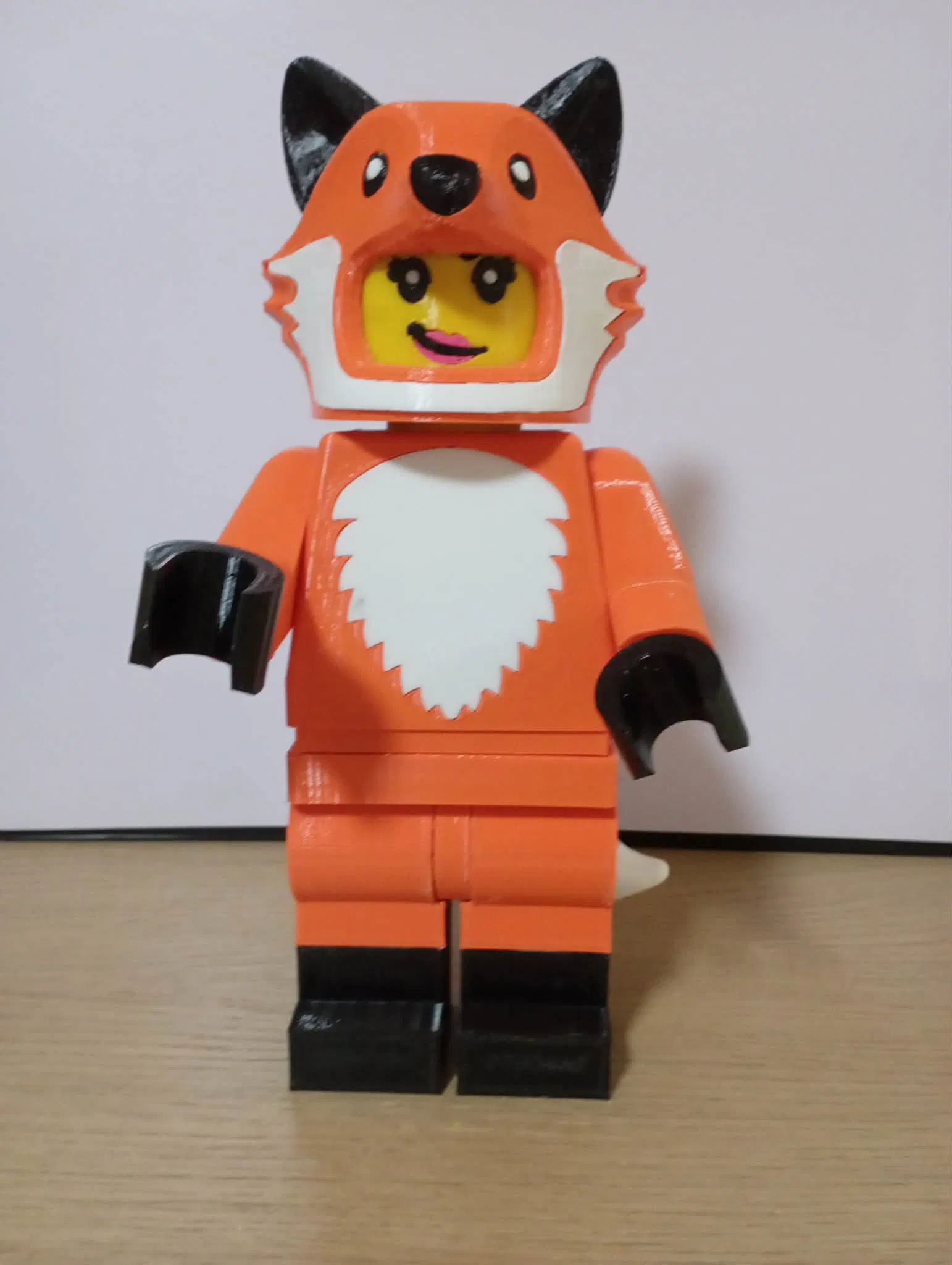 Mẫu Fox Costume Girl Giant Minifig dành để in lớn: khuyến nghị in ở scale 150%. Nếu tai lắp quá chặt, giảm riêng phần tai 1–2% để vừa khít hơn. Phần đuôi là bản remix từ nguồn khác.